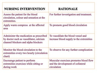 This document provides information about Raynaud's disease. It begins with an introduction that defines Raynaud's as a rare disorder affecting the arteries that causes vasospasm and reduced blood flow to the fingers and toes. It then covers the classification of Raynaud's disease into primary and secondary types. The causes, risk factors, pathophysiology, clinical manifestations, diagnostic evaluations, treatment options including medications and surgery, complications, health education, and nursing care plans are all discussed in detail.