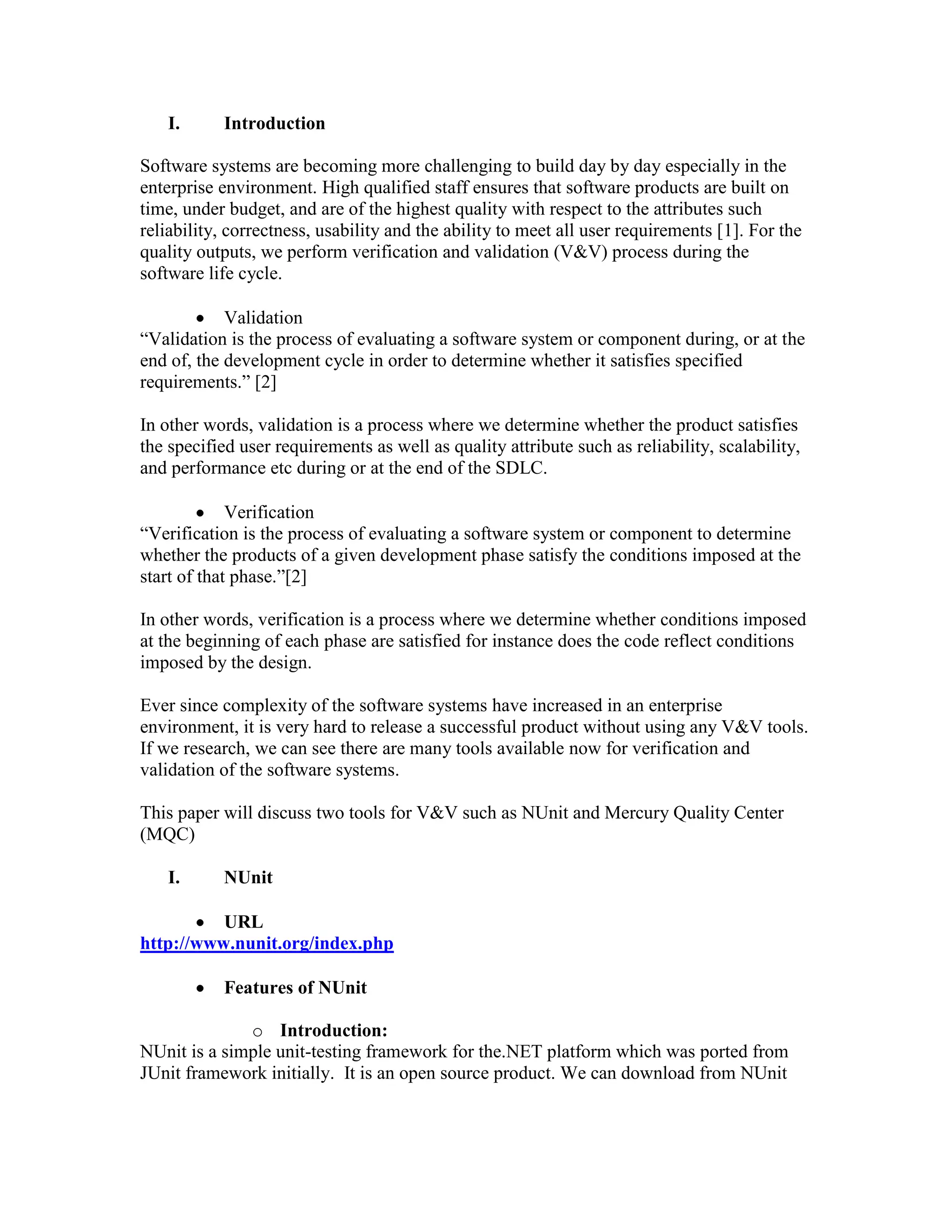 The document discusses two tools for software verification and validation (V&V): NUnit and Mercury Quality Center (MQC).