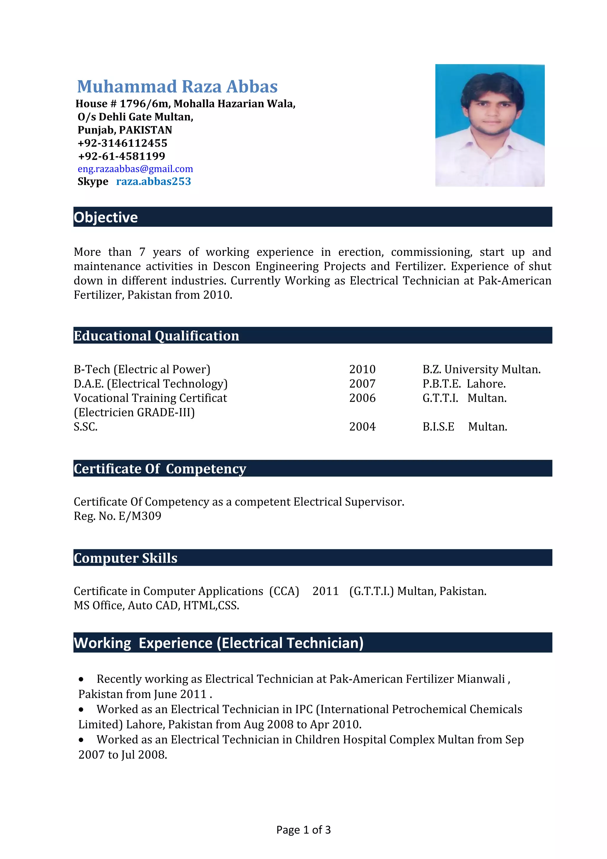 Muhammad Raza Abbas is an electrical technician with over 7 years of experience in erection, commissioning, start up, maintenance, and shutdown activities for various industries in Pakistan. He holds a B-Tech in Electrical Power Engineering and certificates in computer applications and electrical technology. Currently he works as an electrical technician at Pak-American Fertilizer, where his responsibilities include supervising maintenance of electrical systems, generators, motors, transformers, and more. He also has experience planning and executing shutdowns, installing and troubleshooting instruments, and training junior staff.
