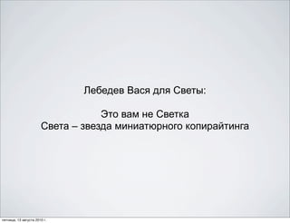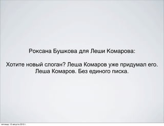 Документ содержит перечень креативных слоганов и идей, представленных различными авторами на цитаты и заметки. Каждый из авторов использует оригинальный стиль и юмор, чтобы донести свою мысль. Все записи датированы 13 августа 2010 года и демонстрируют креативный подход к копирайтингу.