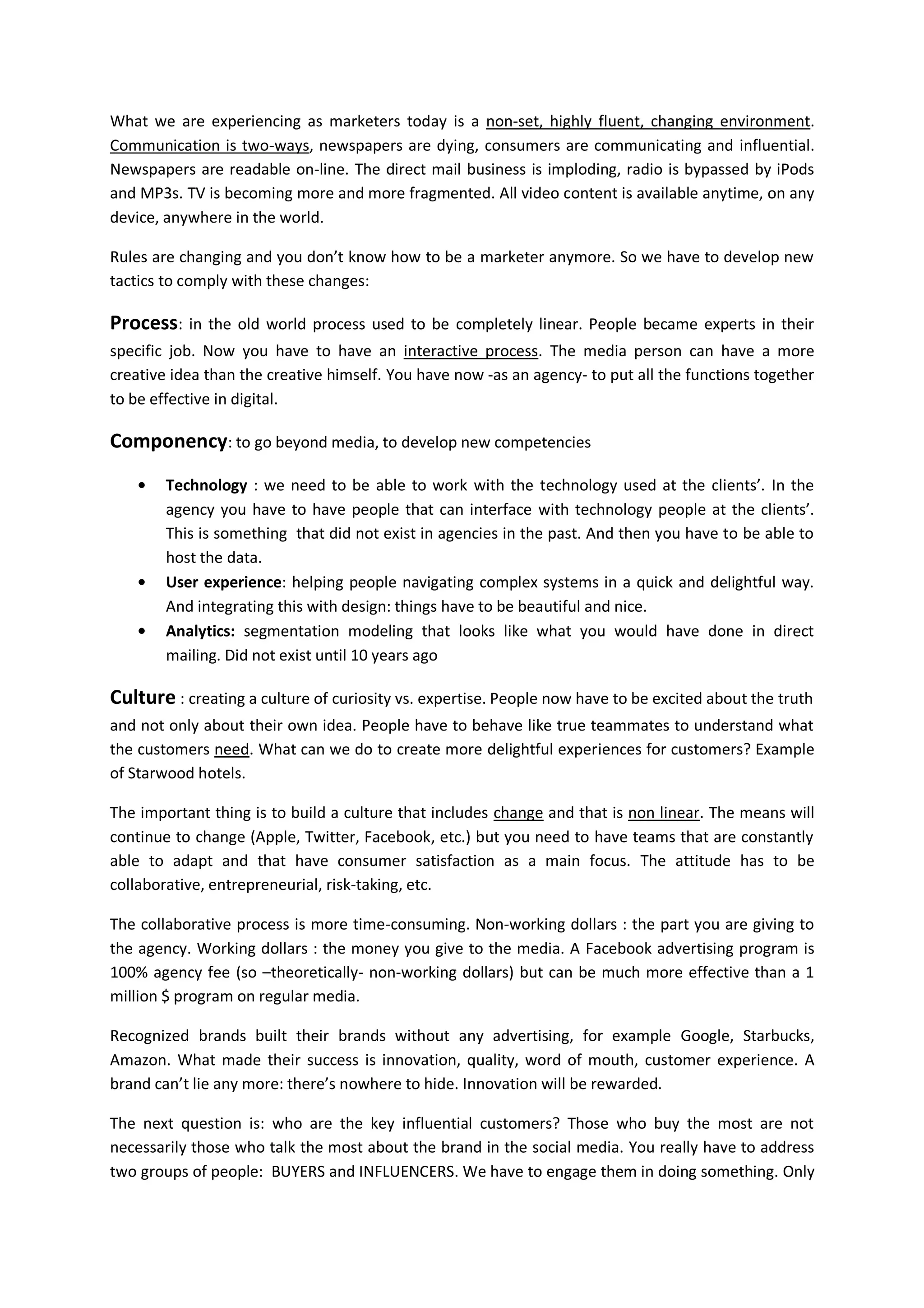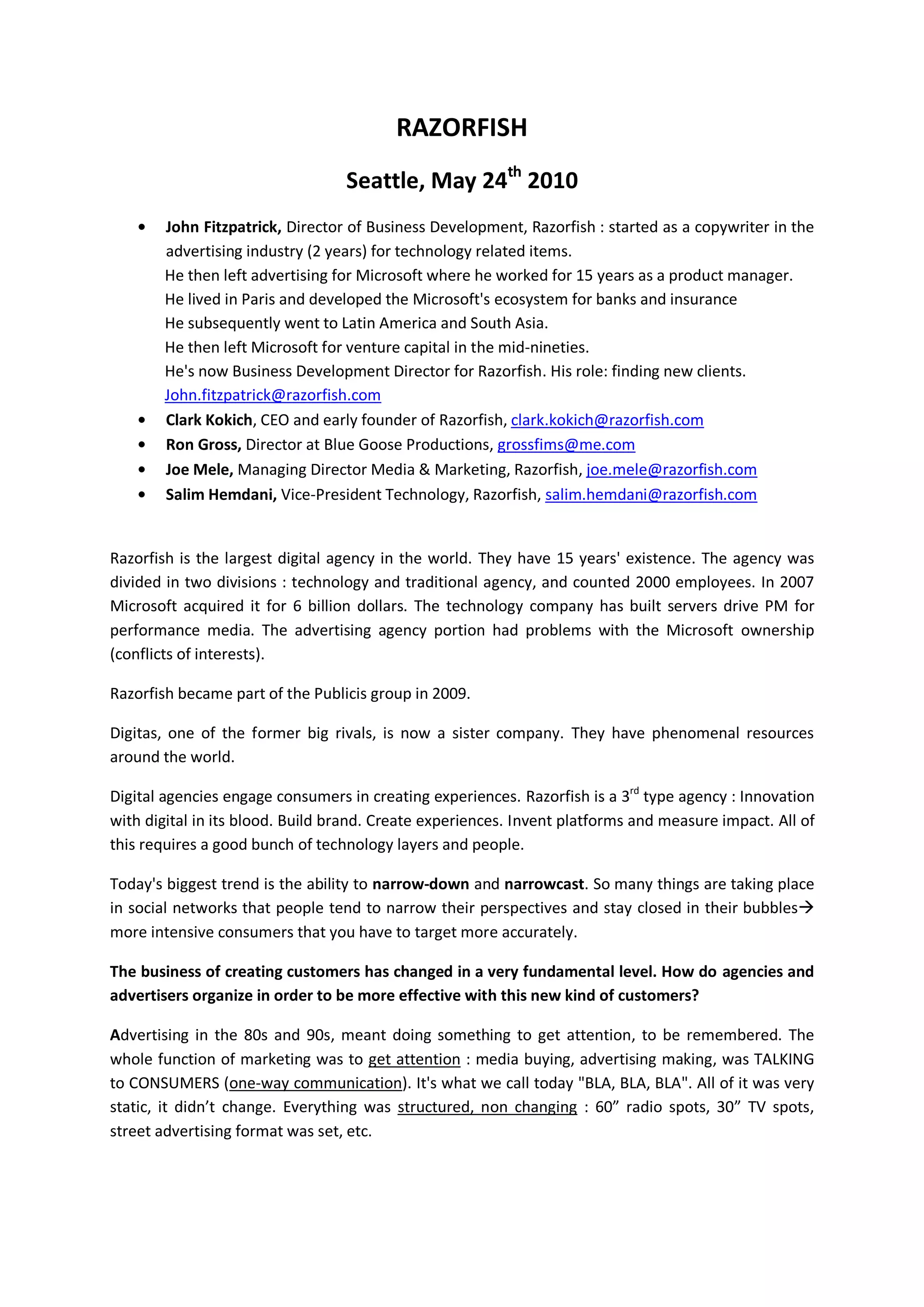 John Fitzpatrick, the Director of Business Development at Razorfish, outlines the agency's evolution and its response to a rapidly changing digital marketing landscape. Razorfish, now the largest digital agency after its acquisition by Microsoft and later Publicis, emphasizes the importance of innovation, two-way communication with consumers, and leveraging technology to create engaging customer experiences. The document also discusses the challenges brands face in adapting to new consumer behaviors and the necessity for agencies to collaborate across various functions to stay relevant and effective.