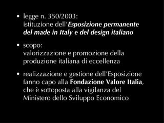 La legge n. 350/2003 istituisce un'esposizione permanente per valorizzare e promuovere il made in Italy e il design italiano. La gestione dell'esposizione è affidata alla Fondazione Valore Italia, sotto la vigilanza del Ministero dello Sviluppo Economico. Il documento menziona anche eventi come 'the big bang 2.0' e '100 x 100 futurfashionshow'.
