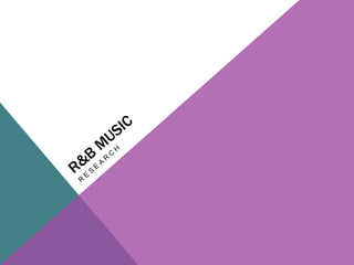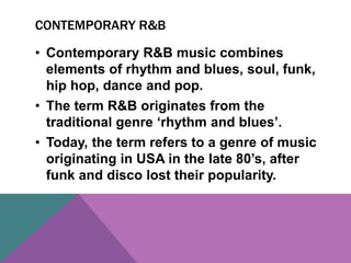 Contemporary R&B emerged in the late 1980s combining elements of rhythm and blues, soul, funk, hip hop, dance, and pop. It originated from traditional R&B, which categorized music aimed at the urban African American market in the 1940s. Major influential artists in the development of contemporary R&B included Motown label artists like Marvin Gaye and The Supremes in the 1960s as well as Michael Jackson in the 1980s. Leading R&B artists of the 1990s-present that achieved commercial success include Usher, Beyoncé, Rihanna, and Bruno Mars.