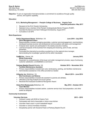 Ross Barton is a marketing management student at Virginia Tech expected to graduate in May 2017. He has held several internships and jobs demonstrating skills in customer service, business operations, and facilities maintenance. These experiences include store management intern at Kohl's, externship at FedBid, facilities maintenance at a church, site coordinator and referee for youth sports, and team member at Chick-Fil-A. He maintains a 3.32 GPA and received several academic scholarships. His objective is to join an organization committed to excellence through quality service and superior capability.