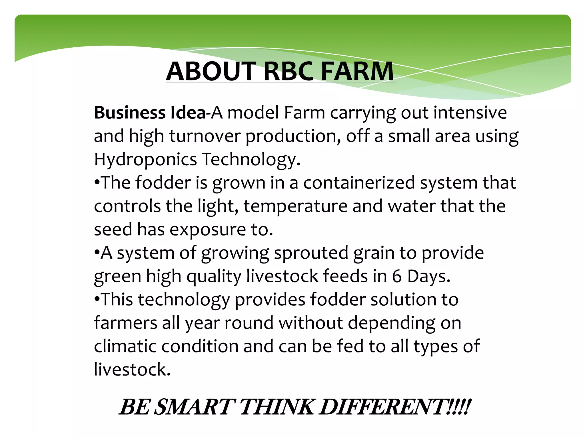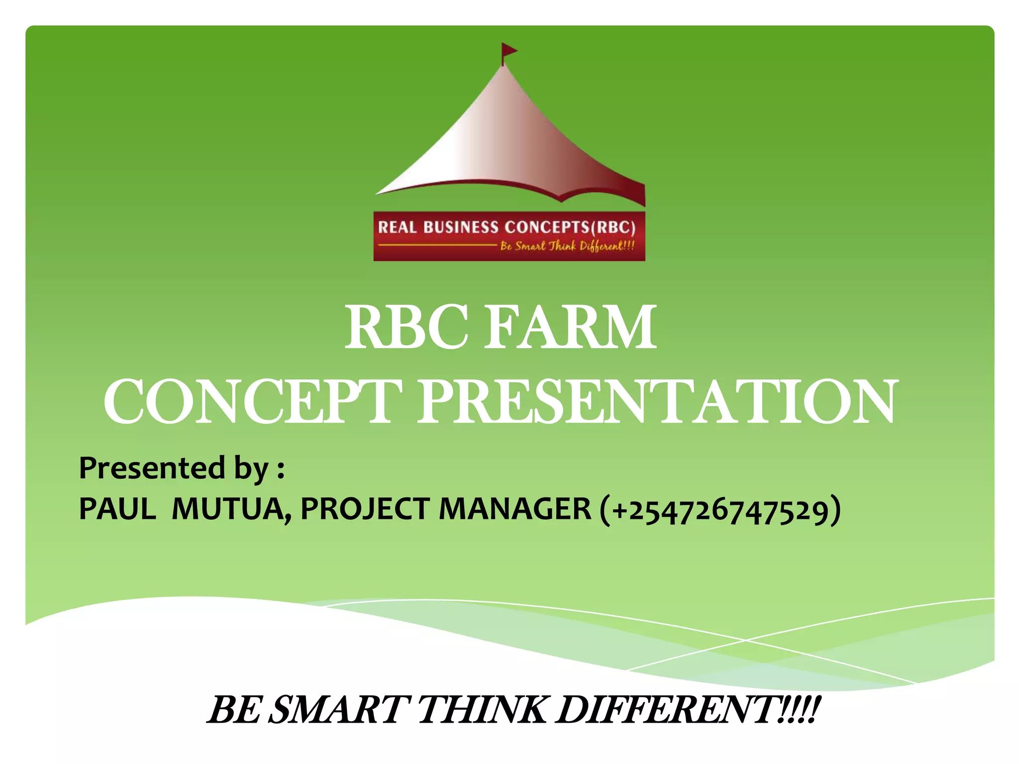 The RBC Farm concept, presented by Paul Mutua, focuses on a model farm using hydroponics to produce high-quality livestock feed year-round, independent of climate conditions. The venture aims to cater to the Kenyan market and progress towards international markets by partnering with various organizations for technical support and market access. RBC Farm also aspires to create job opportunities and enhance local agribusiness through initiatives like agro-tourism and training for community members.