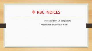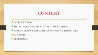 RBC indices like MCV, MCH, MCHC and RDW provide quantitative measurements of red blood cell size and hemoglobin content that can help diagnose different types of anemia. A low MCV and high RDW indicate iron deficiency anemia, while a high MCV and RDW suggest megaloblastic anemia. The combination of various RBC index measurements, especially with RDW, aids in the differential diagnosis of anemias. However, RBC indices alone cannot definitively diagnose disorders and require correlation with other test results.