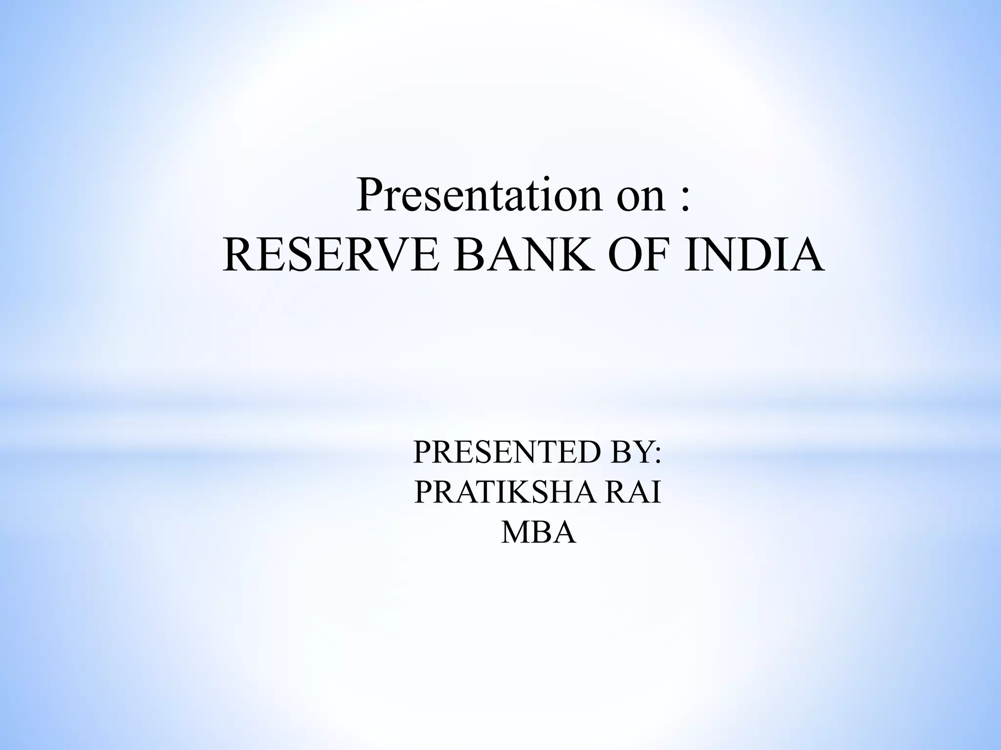 The Reserve Bank of India (RBI) is India's central bank. It was established in 1935 under the Reserve Bank of India Act and is headquartered in Mumbai. RBI was set up on the recommendations of the Hilton Young Commission in 1926. Some key points about RBI: