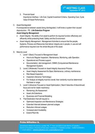 This document outlines the course content for a class on Risk Based Inspection. The course will cover asset integrity management, risk concepts, and risk-based maintenance. It will define different types of assets, discuss maturity levels in asset integrity management, and models for accident causation. The goal is to teach students how to prioritize maintenance based on risk to prevent failures and extend the life of assets.
