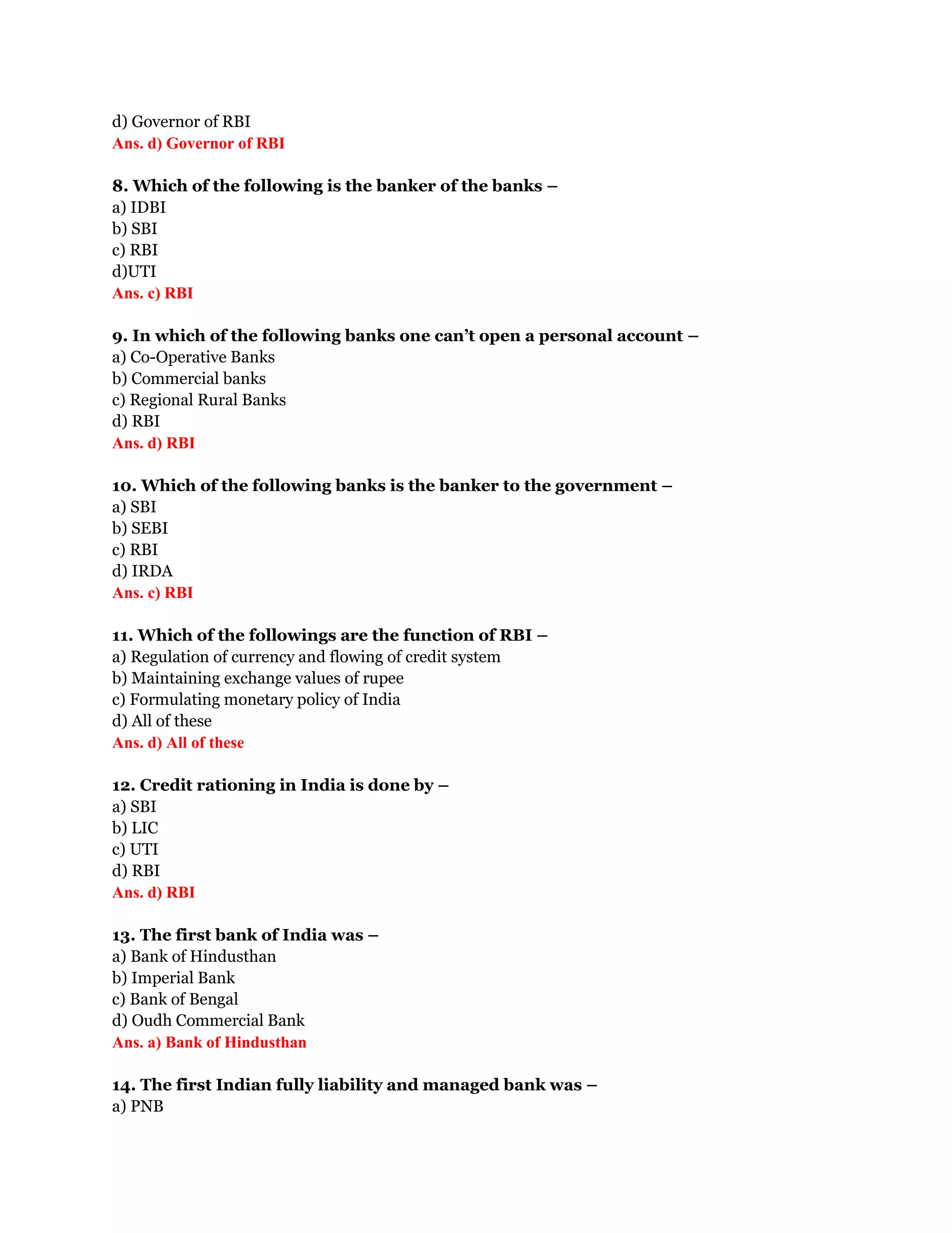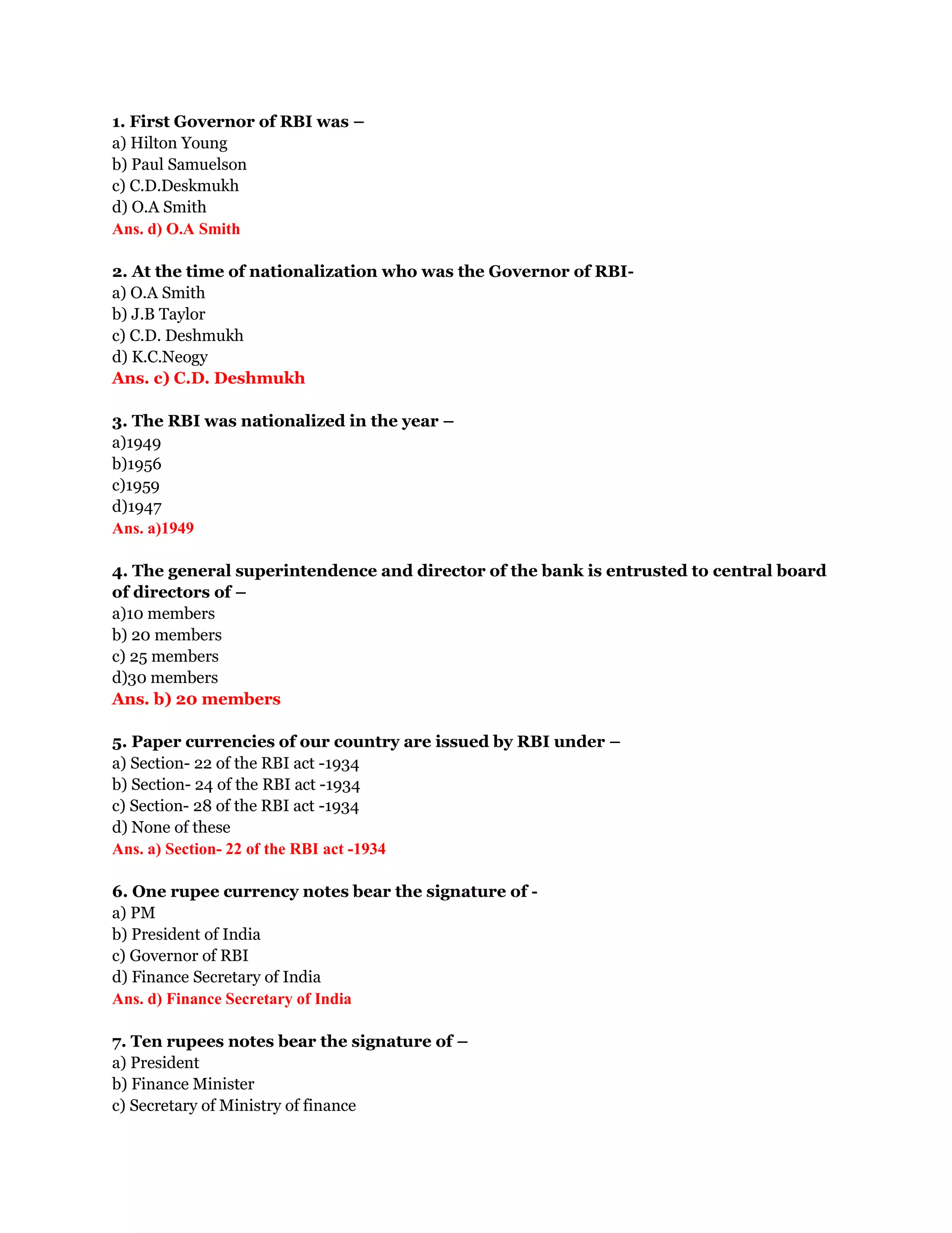 The document contains 50 multiple choice questions about the Reserve Bank of India (RBI). It tests knowledge about the history of RBI, its functions, monetary policy tools, banking regulations, and other banking terms. Some key points covered include: the first governor of RBI was O.A. Smith; RBI was nationalized in 1949; it regulates currency and credit in India; and acts as the banker, lender of last resort, and debt manager for the government.