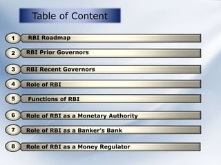 The document provides information about the roles and functions of the Reserve Bank of India (RBI). It discusses RBI's role as a monetary authority, banker's bank, money regulator, issuer of currency and licenses. It outlines the powers of RBI in controlling money supply through various quantitative measures like cash reserve ratio (CRR), statutory liquidity ratio (SLR), repo rate, and reverse repo rate. Examples are given of how CRR, SLR and repo rate work. Past and recent governors of RBI are also mentioned.