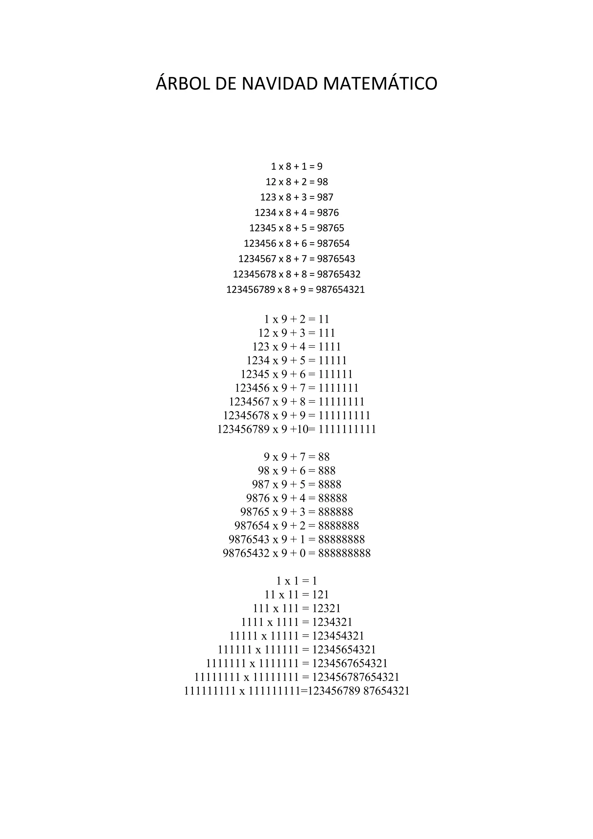 This document presents a mathematical Christmas tree pattern where multiplying a number by 8 or 9 and adding a digit creates a new line that follows the same pattern. The tree has 3 sections - the first multiplying by 8 and counting up, the second multiplying by 9 and counting up, and the third multiplying single digit numbers by themselves.