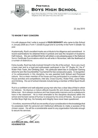 Rudi Boshoff has been a student at Boys High School since 2006. Academically, he has achieved excellent marks including three A symbols, and the school is confident he will pass the National Senior Certificate Examinations with distinctions. Extracurricularly, Rudi is involved in rugby, water polo, climbing, and computer gaming where he has won tournaments and received colors. Rudi displays maturity, courtesy, sensitivity to others, and integrity. The headmaster recommends Rudi as possessing the attributes to succeed in his chosen career and be an asset to any organization.