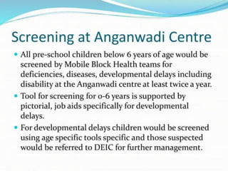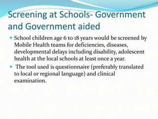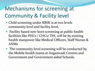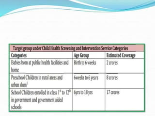 The Rashtriya Kishor Swasthya Karyakram (RKSK) or National Adolescent Health Programme was launched in 2014 in India. It aims to improve the health of adolescents aged 10-19 by focusing on nutrition, sexual and reproductive health, mental health, injury and violence prevention, and substance abuse prevention. The programme seeks to achieve its objectives through community-based interventions like peer education, adolescent health days, and iron supplementation, as well as facility-based interventions like adolescent friendly health clinics. It also promotes convergence between different government departments and schemes related to adolescent health and development.