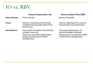 The document summarizes key differences between the Industrial Organization (IO) view and Resource-Based View (RBV) of firms. The IO view focuses on external industry conditions and assumes firms have identical resources, while the RBV focuses on internal characteristics and assumes resources are heterogeneous.
