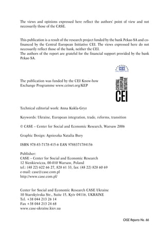 The document is a report published by CASE that analyzes the prospects for economic relations between the EU and Ukraine, highlighting key areas such as trade, reforms, and the implementation of the Ukraine-EU action plan. It covers various economic policies, structural reforms, and challenges to deep integration, including labor movement and EU perspectives on Ukraine's accession. The publication is a result of a research project funded by Bank Pekao SA and provides extensive insights into the economic landscape and future developments for Ukraine in relation to the European Union.