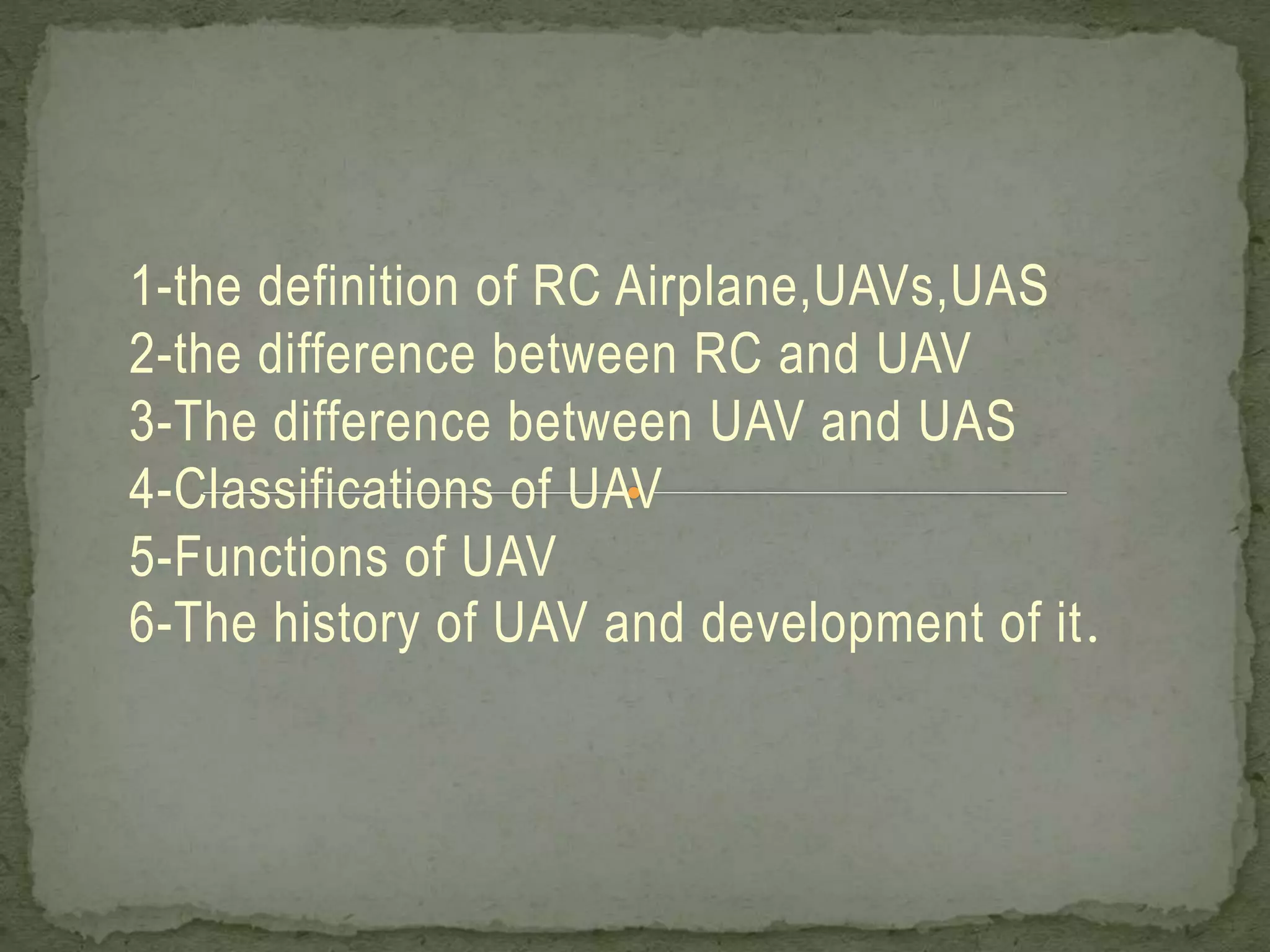 The document discusses unmanned aerial vehicles (UAVs) and radio-controlled aircraft (RCA). It defines UAVs as aircraft that can operate autonomously or via remote control, while RCA require constant manual control. A key difference is that UAVs perform practical missions while RCA are for recreation. The document also covers classifications of UAVs by range/altitude and functions including reconnaissance, research, and combat. It provides a brief history of UAV development from the U.S. Civil War to modern systems like the Predator and Global Hawk drones.