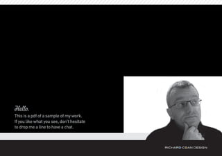 This document provides samples of graphic design work including logos, illustrations, icons, visuals for brochures and posters, packaging designs, and advertising concepts. It introduces the designer and their services, skills, equipment, and contact information. The designer invites the reader to have a conversation if they like what they see.