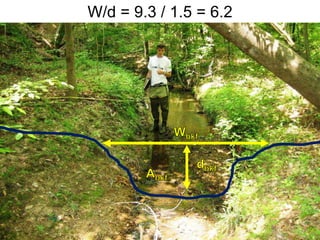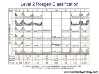 This document provides an overview of the Rosgen stream classification system. It describes the key factors that influence stream morphology and outlines the major stream types according to their physical characteristics such as channel geometry, slope, and landscape position. These include A, B, C, E, F, and G stream types that vary in terms of incision, width, depth, slope, and valley confinement. The Rosgen system involves measuring field parameters like entrenchment ratio, width-to-depth ratio, and substrate to classify streams.