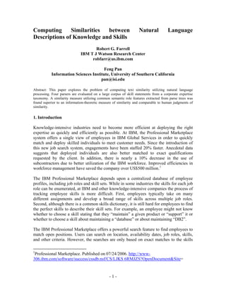 This document summarizes research on computing similarities between natural language descriptions of knowledge and skills. It evaluates four parsers on their ability to extract semantic role information from skill statements. A similarity measure based on common semantic roles extracted from parse trees was found to be superior to a statistical information-theoretic measure and comparable to human judgments of similarity. The research aims to improve job searching by finding approximate instead of just exact matches between available employees and open positions based on related skills.