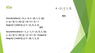 The document discusses cryptographic algorithms and keys. It describes the RC4 algorithm which uses a key stream to encrypt plaintext into ciphertext. It involves initializing a state array S with permutations, then generating a pseudo-random key stream by swapping array bytes based on the key and indices i and j. The key stream is then combined with plaintext to produce ciphertext. The document also mentions SSL and provides several references on RC4, WEP attacks, and cryptographic algorithm breakdowns.