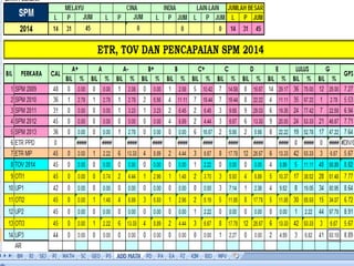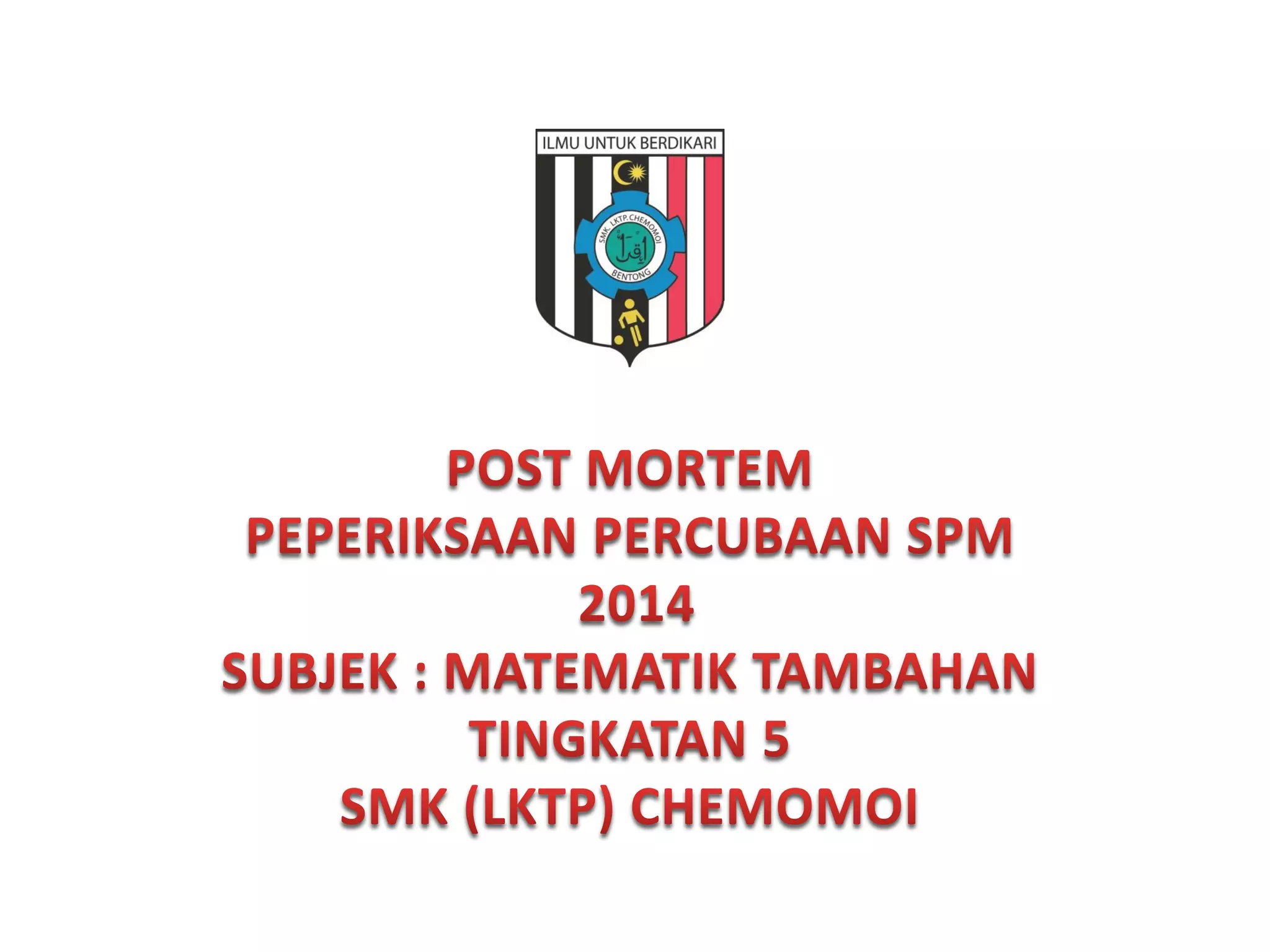 Dokumen tersebut memberikan perbandingan keputusan peperiksaan Matematik Tambahan tahun 2013 untuk beberapa kelas. Ia menunjukkan bilangan dan peratusan pelajar yang lulus dan gagal serta GPS bagi setiap kelas. Dokumen ini juga menganalisis pencapaian peperiksaan percubaan bagi Matematik Tambahan tahun 2014.