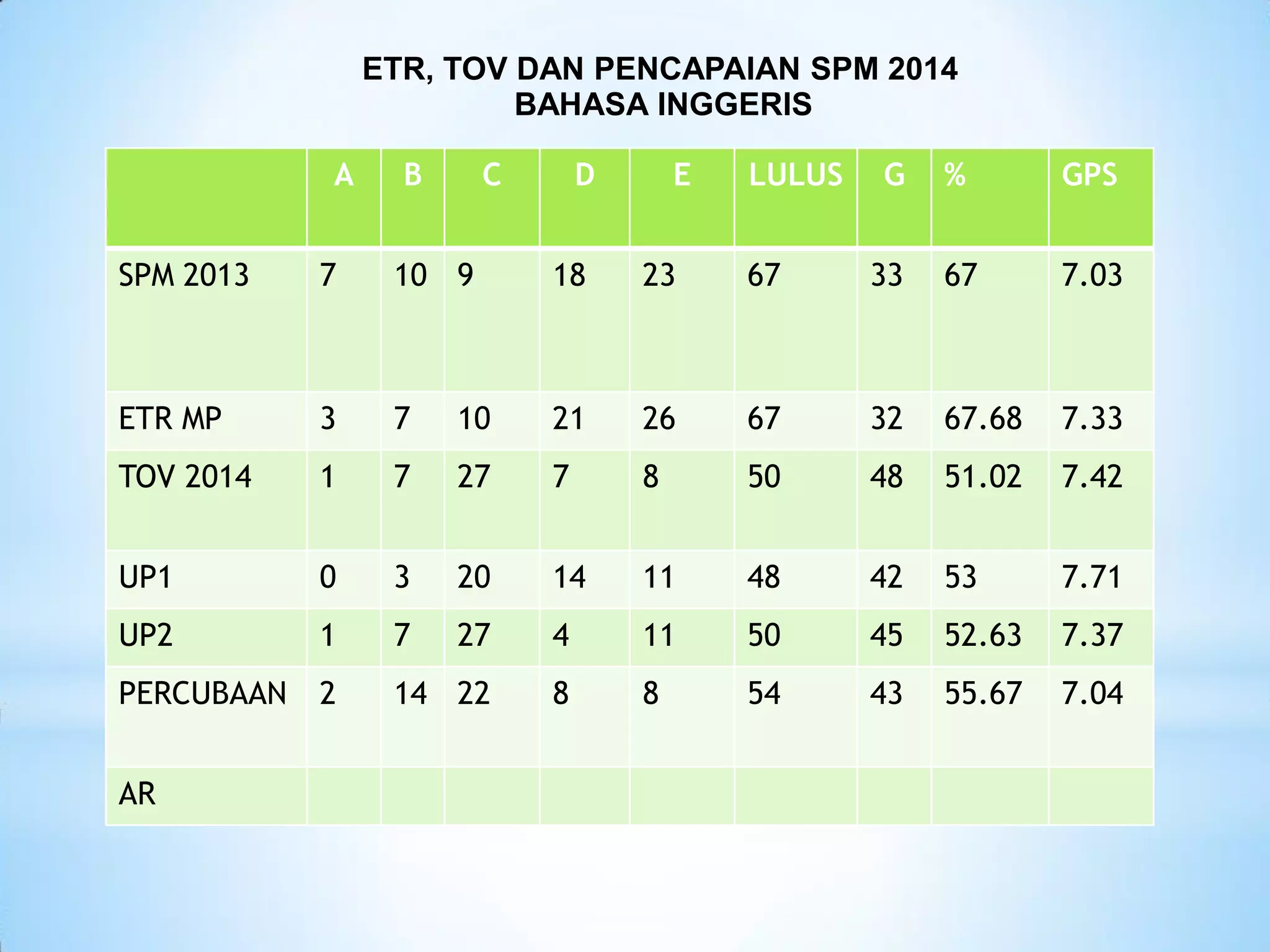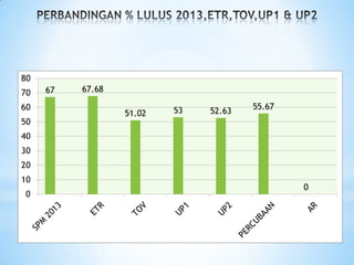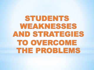 The document provides information on students' weaknesses and strategies to overcome problems in learning English based on results from SPM 2014. It identifies weaknesses such as being weak in paper 1 (continuous writing), lacking ideas and vocabulary. Strategies suggested include providing more guided writing modules, vocabulary exercises, and an English clinic. Weaker students require simpler essay guides, while critical students need drilling on grammar and memorization techniques.