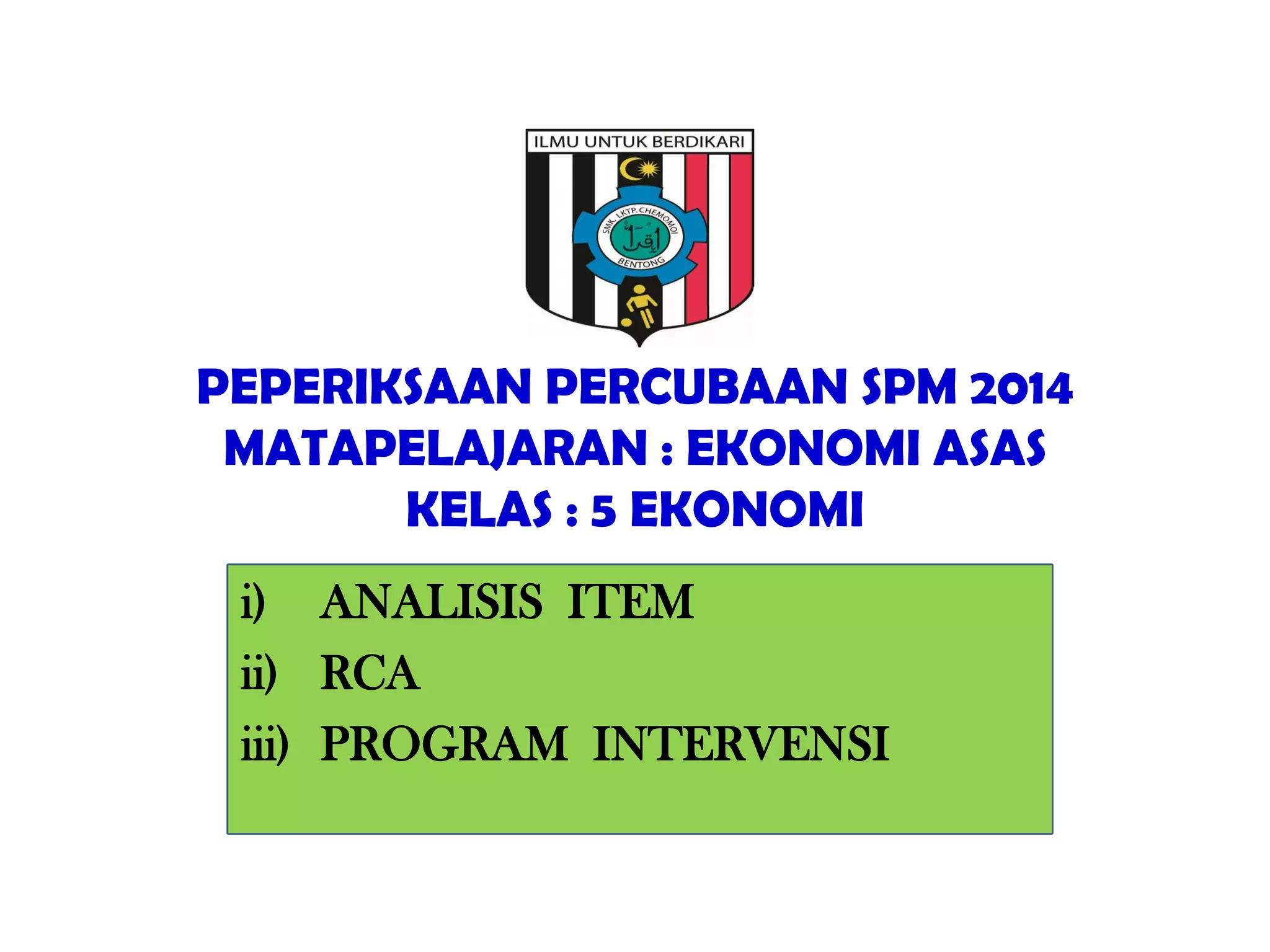Dokumen tersebut memberikan ringkasan mengenai pencapaian peperiksaan percubaan SPM 2014 mata pelajaran Ekonomi Asas. Ia menyenaraikan pencapaian pelajar dari tahun 2009 hingga 2014, dengan perbandingan kadar lulus dan GPS bagi beberapa ujian seperti TOV, UP1, PPT dan ETR. Dokumen ini juga mengenalpasti satu pelajar yang gagal serta program intervensi yang dirancang untuk meningkatkan pencapaian pelajar terse
