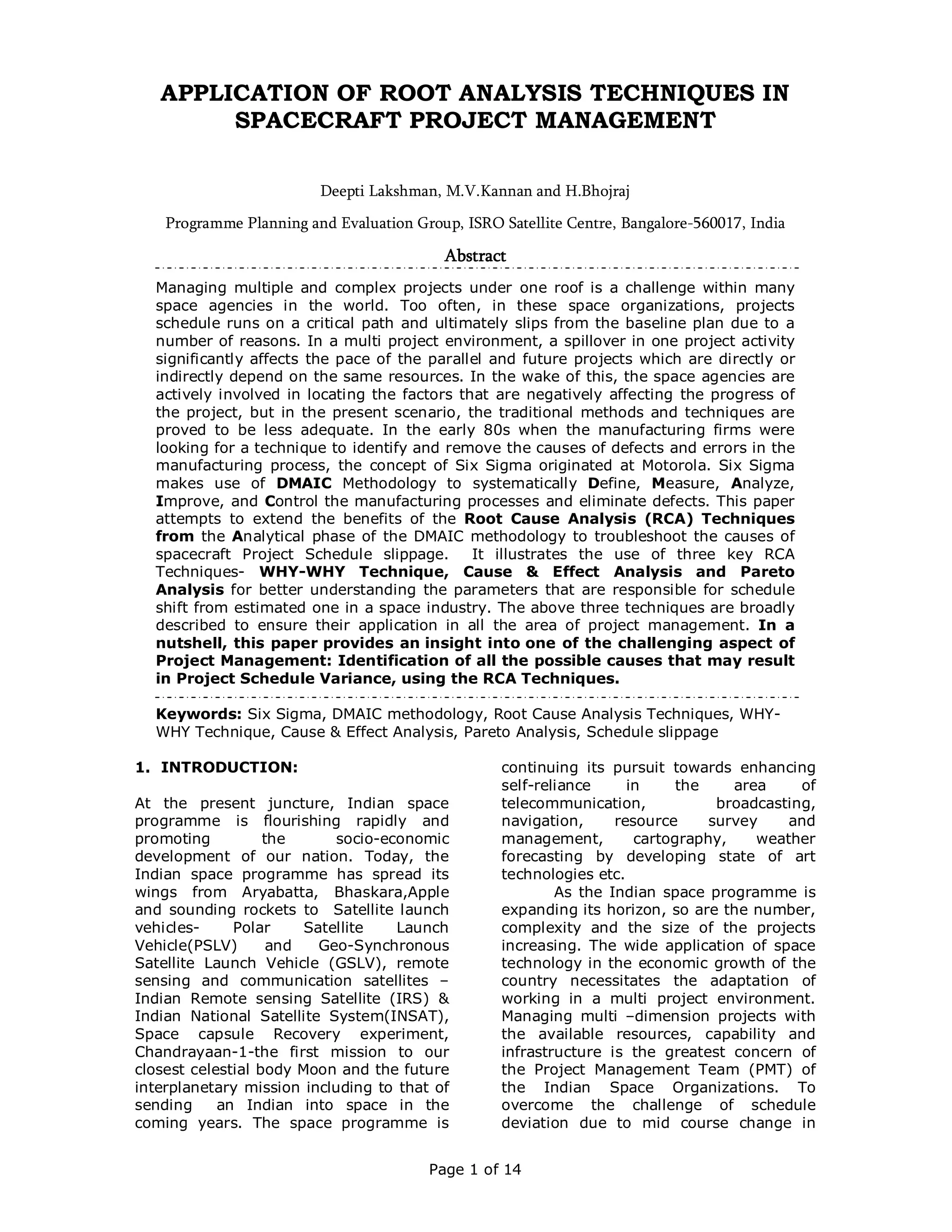 This document discusses the application of root cause analysis techniques from Six Sigma's DMAIC methodology to identify factors causing schedule slippage in spacecraft projects. It introduces Six Sigma and DMAIC, which includes defining problems, measuring performance, analyzing root causes, improving processes, and controlling future performance. Specifically, it demonstrates using why-why analysis, cause-and-effect diagrams, and Pareto analysis to uncover root causes of delays. Identifying root causes allows project teams to proactively address issues and prevent future schedule variance.