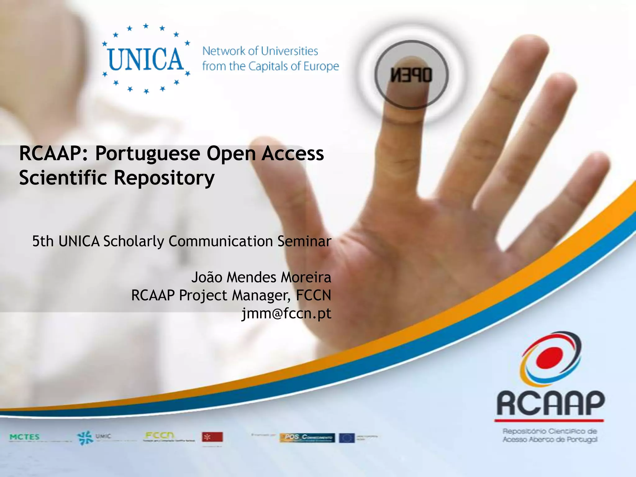 The RCAAP project aims to promote visibility and access to Portuguese scientific output by developing an open access repository and related services. It provides a central portal and repository, institutional repository hosting through the SARI service, and tools for tracking publisher policies and advocating for open access. Usage has grown substantially since starting in 2008, with over 45,000 documents and 32 repositories now included. Future plans include expanding to scientific data and journals, as well as digital preservation. Key factors in its success are a collaborative governance model and service approach, and participation across Portuguese institutions.