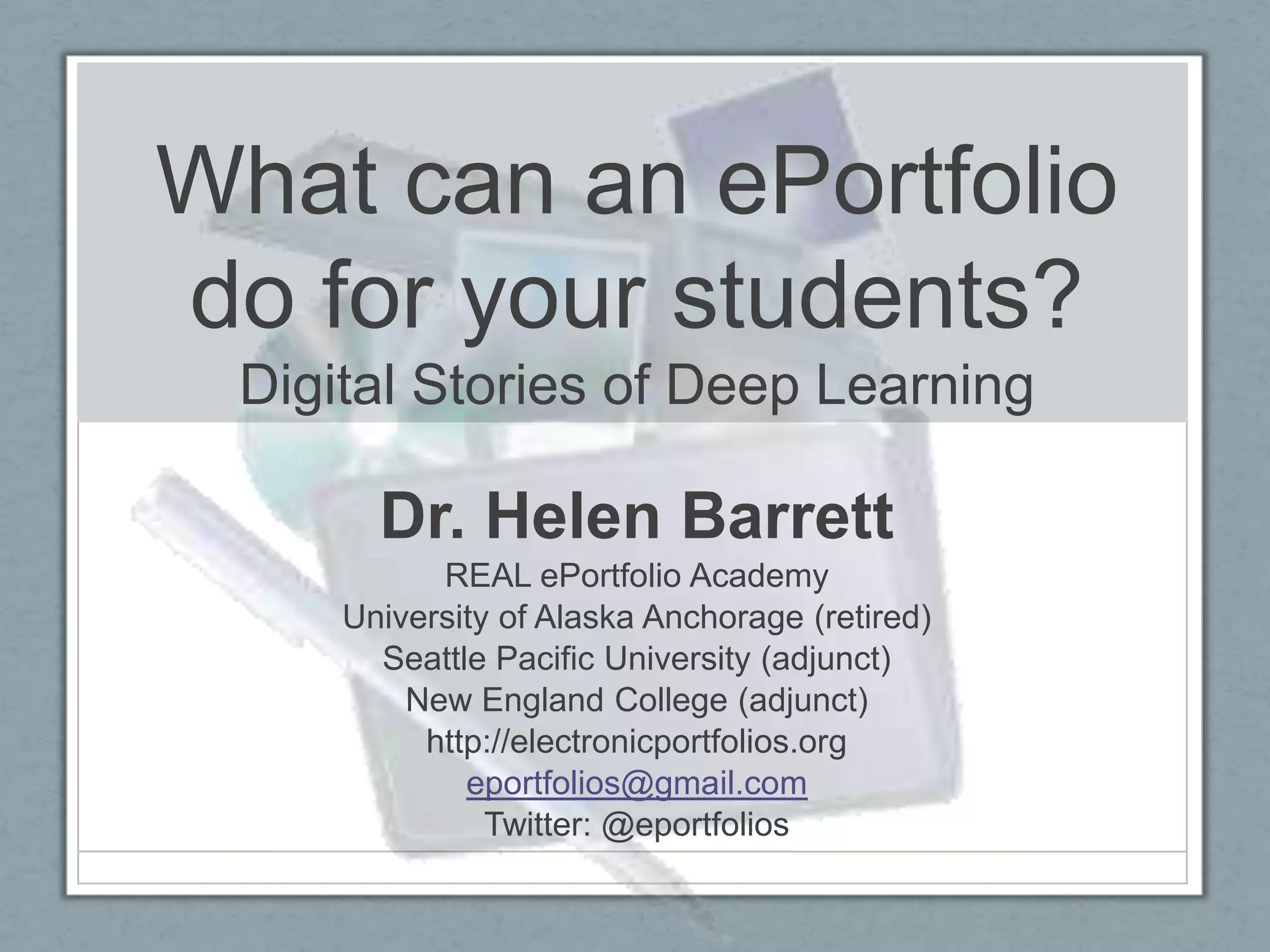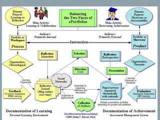 The document discusses how ePortfolios can support deep learning through reflection and multimedia. It explains that ePortfolios have two main purposes: reflection and presentation. Reflection is key as it involves thinking about one's experiences and learning, which is important for self-regulated learning. The document also discusses how digital tools like blogs and stories can support reflection and deep learning.