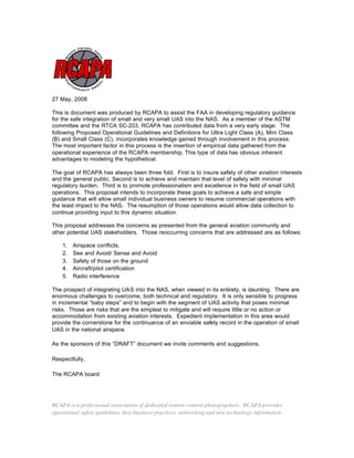 The document outlines proposed integration guidelines for small and very small unmanned aerial systems (UAS) into the national airspace system (NAS) as developed by the Remote Control Aerial Photography Association (RCAPA) to ensure safety while minimizing regulatory burden. It defines operational classifications for different UAS types, detailing restrictions and operational limitations necessary for safe commercial operations. Key concerns addressed include airspace conflicts, ground safety, and operator responsibilities, emphasizing empirical data from RCAPA members to improve safety standards.