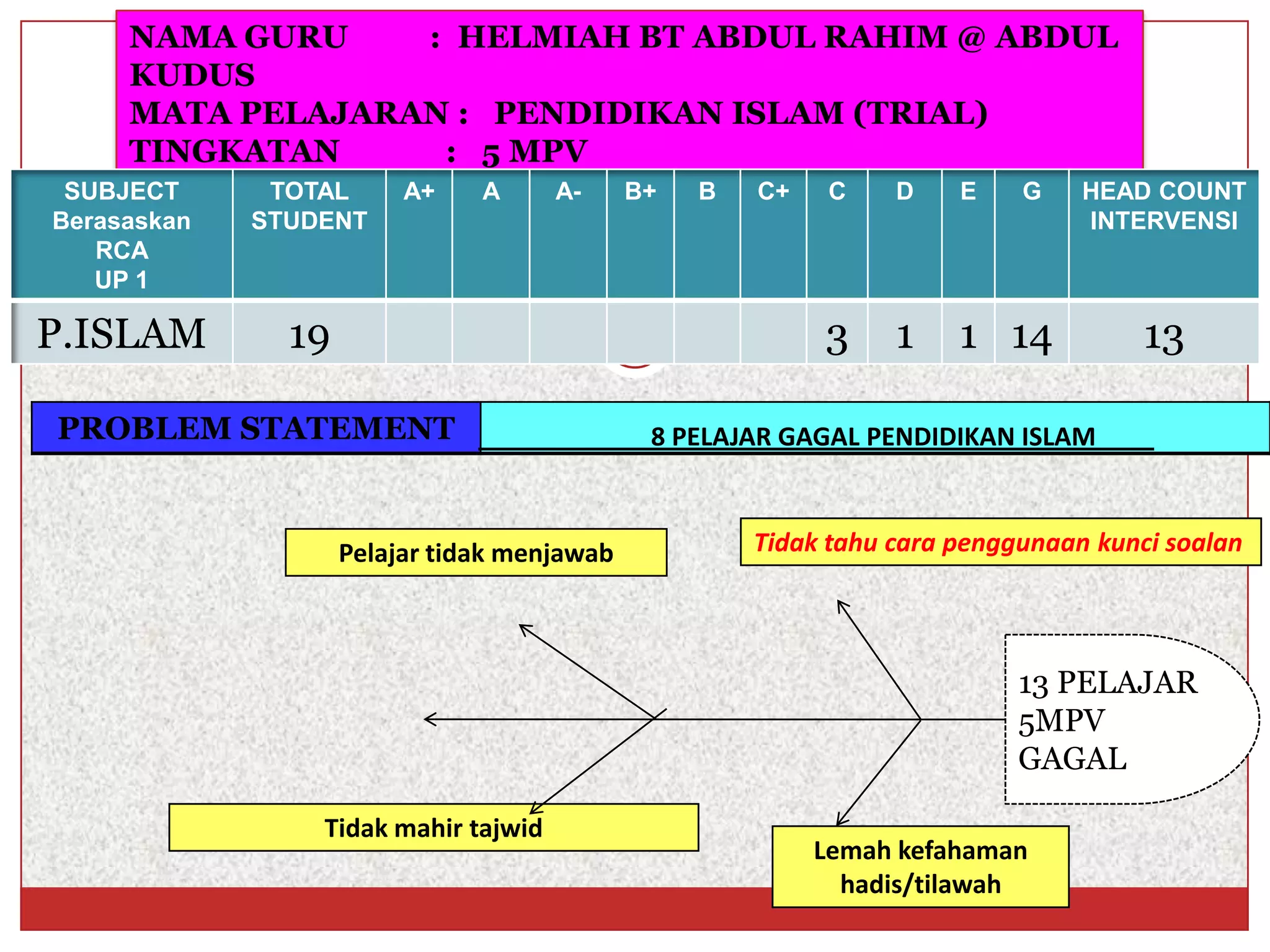 Dokumen ini membahas tentang analisis pencapaian pelajar dalam mata pelajaran Pendidikan Islam di beberapa tingkatan yang menunjukkan sejumlah pelajar gagal akibat lemah dalam tajwid, kefahaman hadis, dan teknik menjawab soalan. Rencana intervensi dirumus untuk meningkatkan pencapaian pelajar dengan pelbagai program latihan dan pengenalan teknik menjawab. Analisis data menunjukkan peratusan lulus dan gagal, dengan langkah-langkah bertujuan memperbaiki kelemahan yang dikesan.