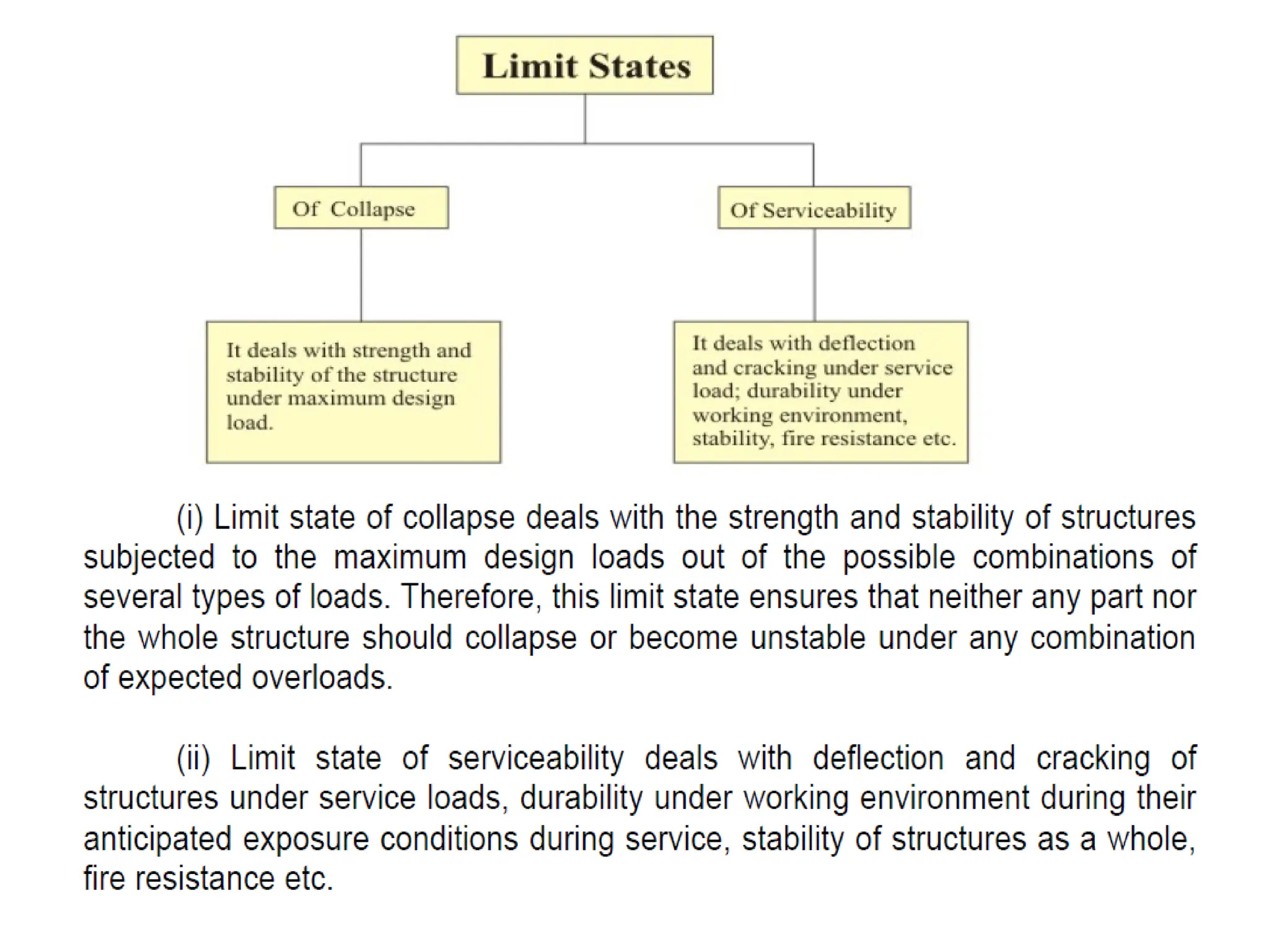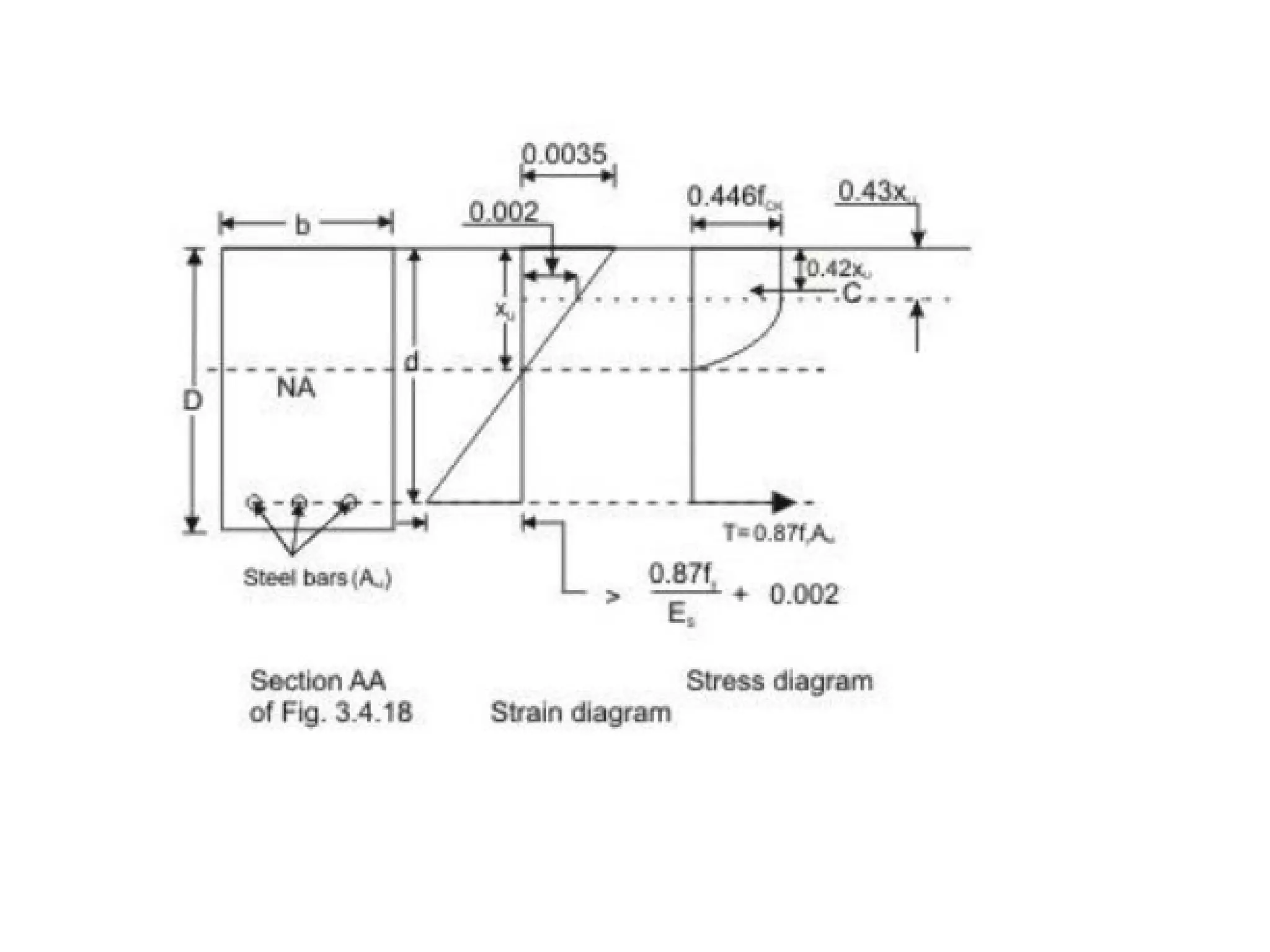 The document outlines the basics of reinforced concrete (RCC) design and the limit state method, emphasizing the distinction between functional and structural design. It details various design philosophies, including the working stress method, ultimate load method, and limit state method, focusing on key concepts such as characteristic strength and partial safety factors. It concludes with analysis principles for singly reinforced beams and explains design load combinations and characteristics necessary for safety and serviceability in structures.