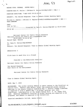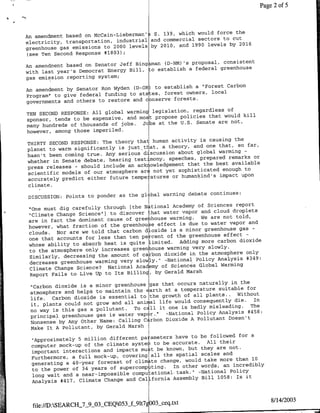The document is an email containing information about an expected debate on global warming in the U.S. Senate. It provides background on expected amendments related to global warming legislation and regulation. It also includes short responses and discussion points that question the scientific consensus around human-caused global warming and the ability of climate models to accurately predict future impacts.