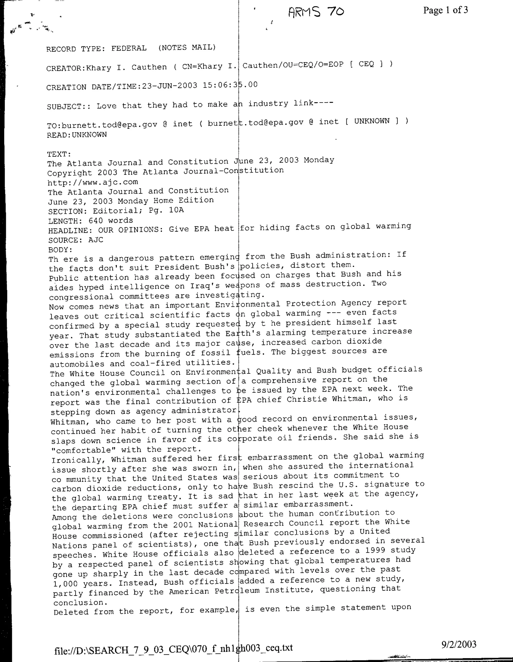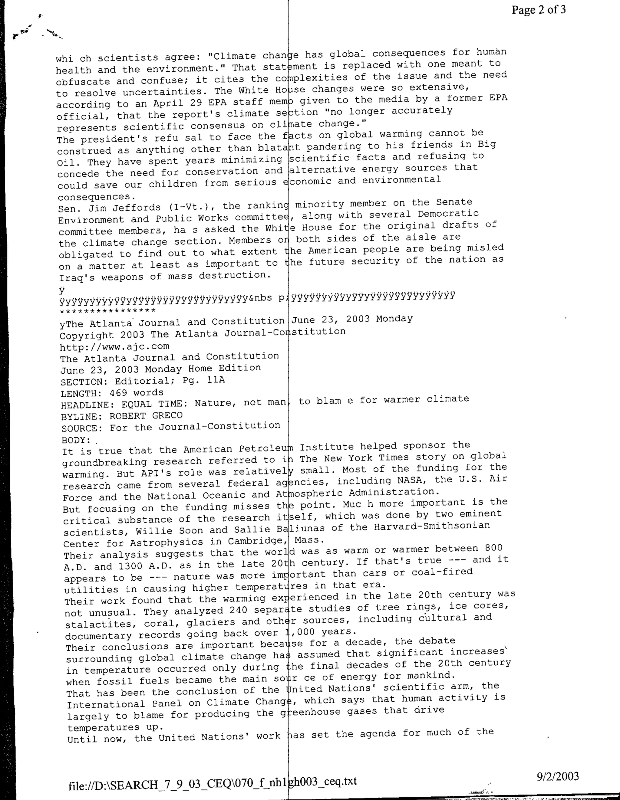The document is an editorial from The Atlanta Journal and Constitution criticizing the Bush administration for removing and altering conclusions about human-caused global warming from an EPA report on environmental challenges. It notes key facts and conclusions about rising global temperatures that were deleted, such as references validating a recent study requested by Bush and conclusions agreed upon by scientists. The editorial argues these deletions mislead the public and amount to pandering to oil industry interests instead of facing the facts on an important issue.