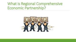 RCEP is a proposed free trade agreement between the 10 ASEAN member states and 6 Asia-Pacific countries - China, Japan, South Korea, India, Australia and New Zealand. Negotiations began in 2012 with the goal of liberalizing trade and investment. If concluded, RCEP would be one of the largest free trade areas in the world, covering nearly half the global population and trade. After 15 rounds of negotiations, members aim to finalize an agreement in 2017 to boost regional economic integration and confidence. However, several issues around intellectual property and market access remain unresolved.