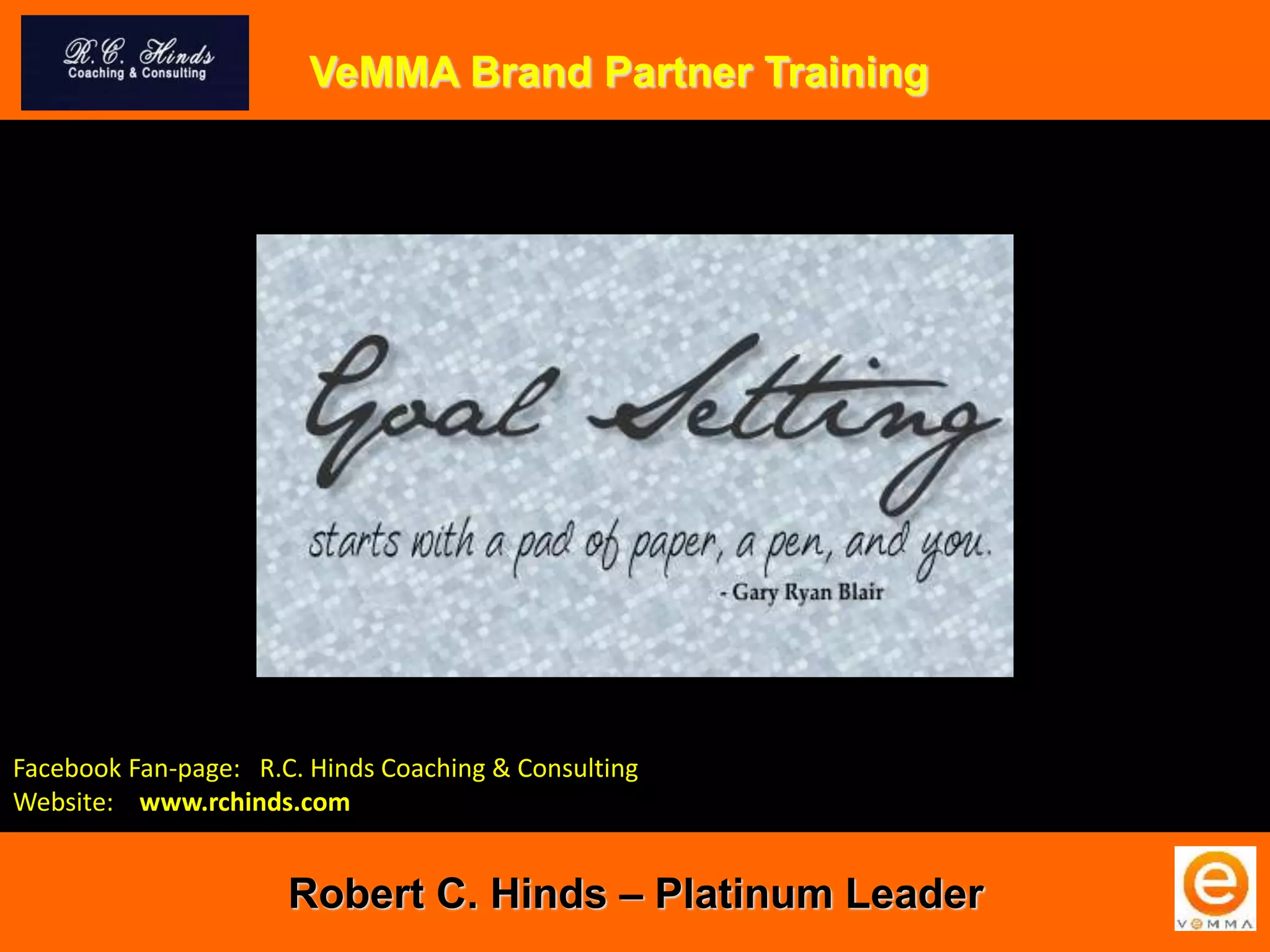 The document outlines goal setting and achieving strategies by Robert C. Hinds, emphasizing a systematic approach to building a business within the Vemma system. Hinds encourages individuals to set clear goals, educate themselves, and utilize tools such as visual aids and accountability partners to track their progress. The presentation includes specific dates for goal setting and rank advancement periods, along with practical action steps for fostering success.