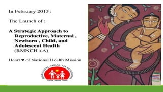 The document summarizes key aspects of India's Reproductive and Child Health (RCH) program. It discusses the phases and goals of RCH Phase I and Phase II, including targets for reducing infant mortality, maternal mortality, and total fertility rates. It describes essential components of RCH like antenatal care, skilled birth attendance, emergency obstetric care, and new initiatives under RCH II such as Janani Suraksha Yojana cash incentives for institutional deliveries. The role of ASHAs in community health and new approaches like IMNCI and RMNCH+A are also highlighted.