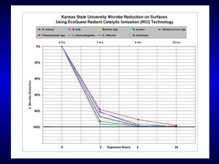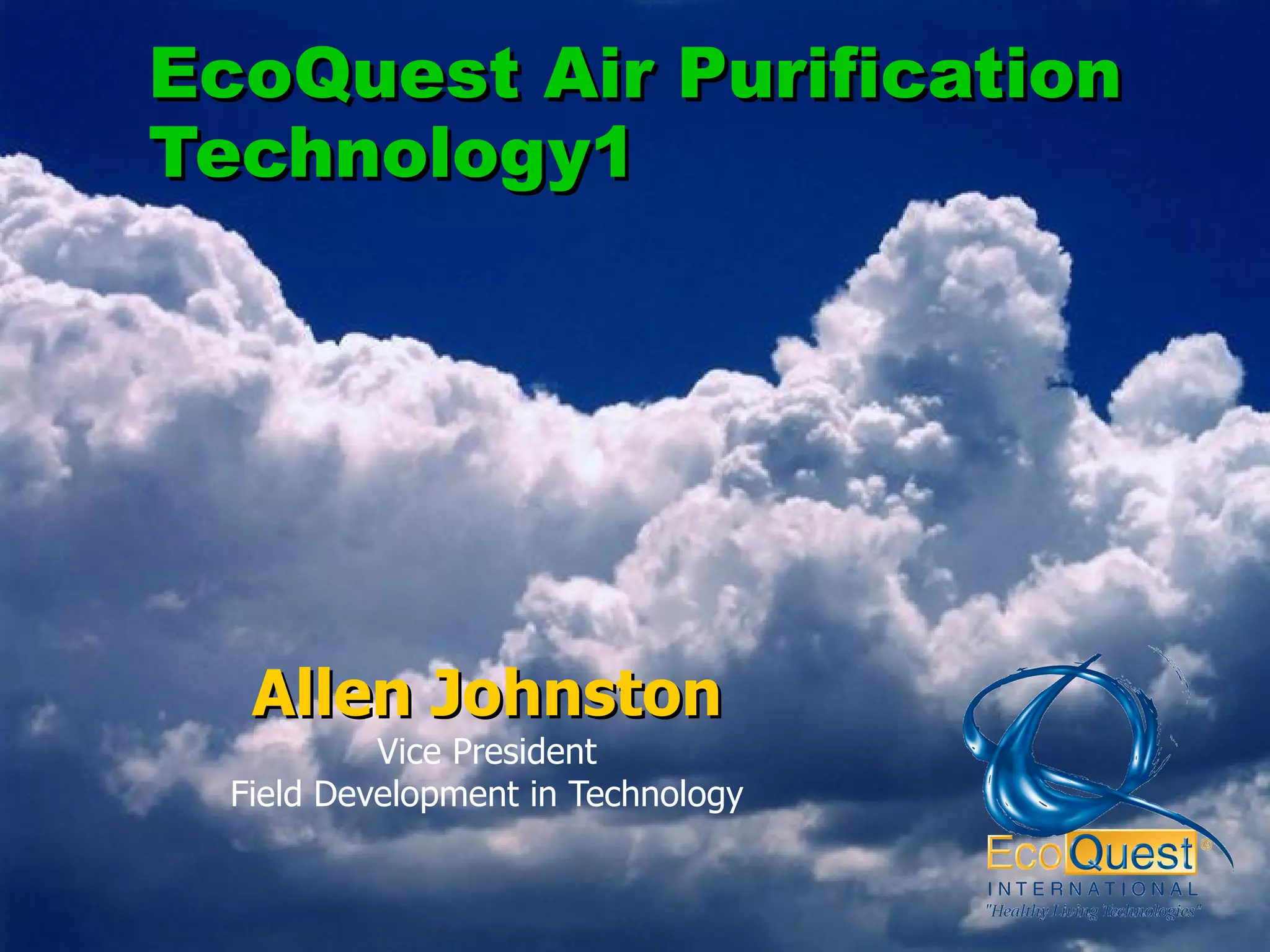 The document discusses indoor air quality issues and various air purification technologies. It provides an overview of EcoQuest's 20-year history developing air purification technologies using ionization, ultraviolet light, photo catalytic oxidation, and low-level ozone to clean indoor air naturally. University testing has shown EcoQuest technologies can reduce airborne particulates and microbes like mold, bacteria and viruses by up to 99.99%.