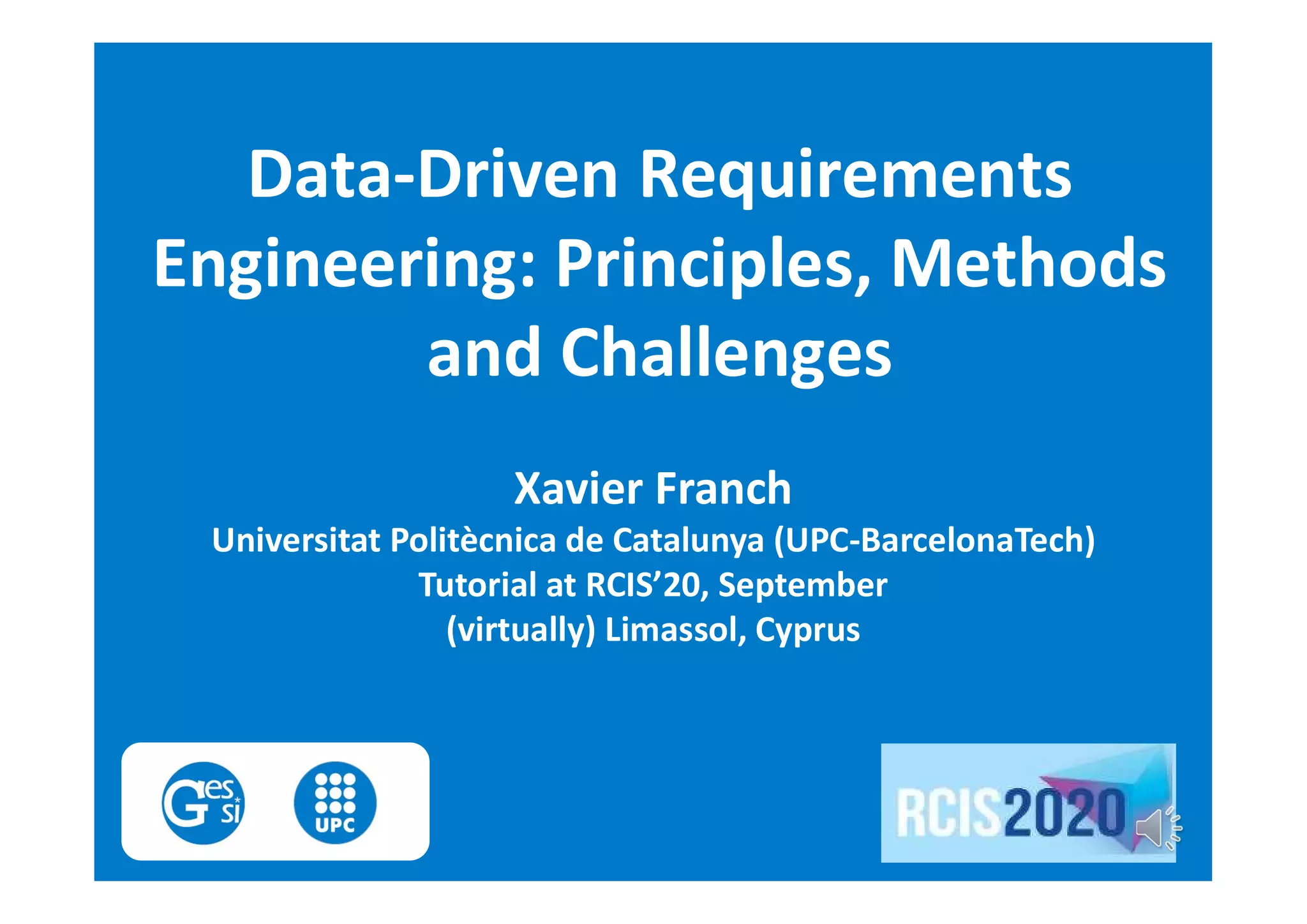 The document discusses data-driven requirements engineering (RE), which uses data collected from system usage to inform the RE process. It describes traditional RE and how data-driven RE aims to supplement it using explicit feedback from users and implicit feedback from usage data. The data is analyzed using natural language processing, machine learning, and topic modeling to categorize issues and identify topics. Challenges of data-driven RE include integrating it into development processes, collecting and processing heterogeneous data, and gaining user trust. Overall, it presents an opportunity to deliver more business value but requires the right approach and consideration of traditional RE methods.