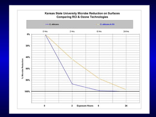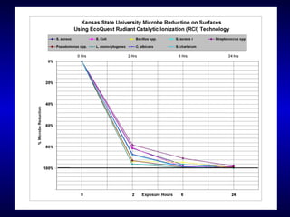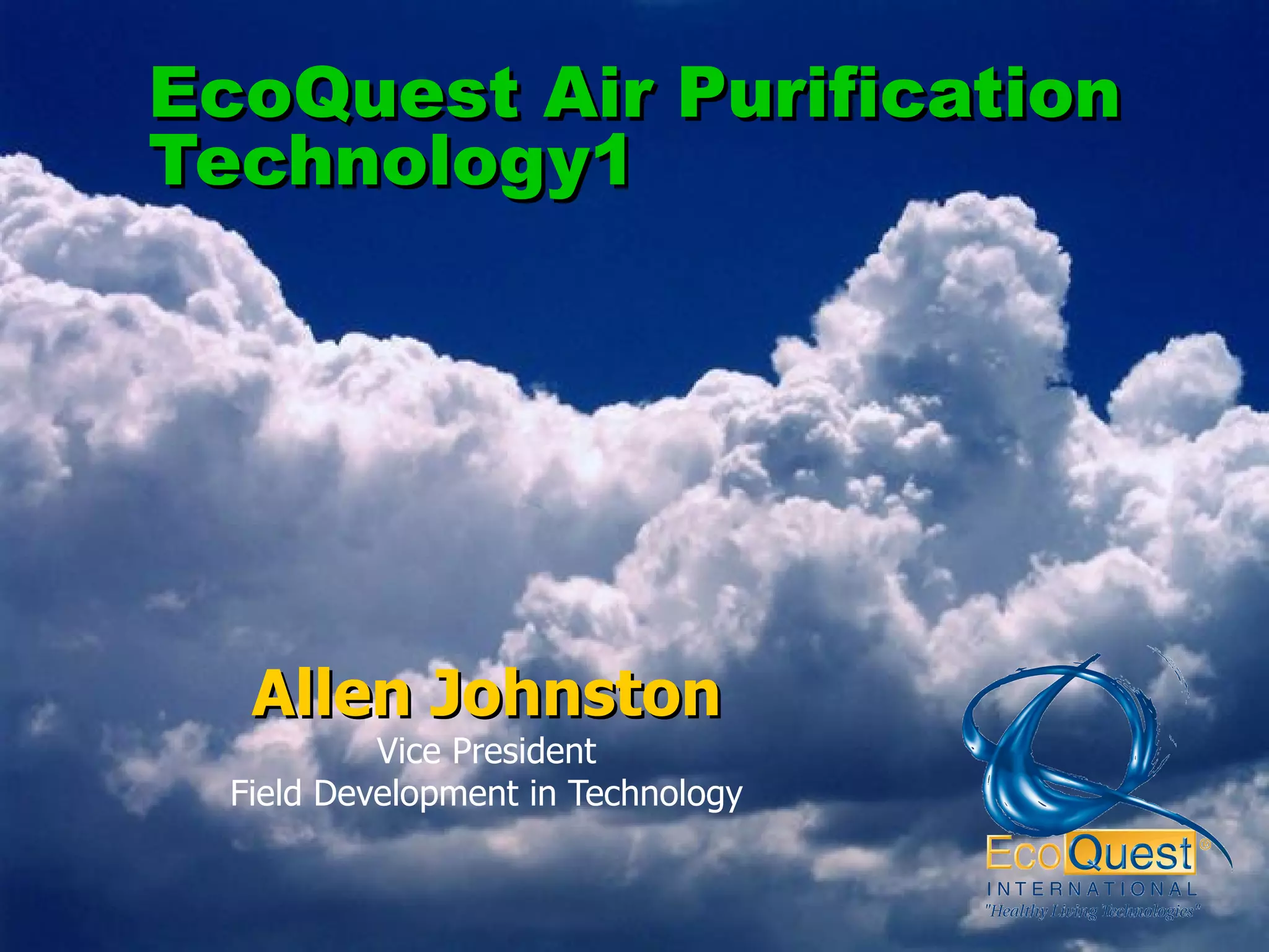 The document discusses indoor air quality issues and various air purification technologies. It provides an overview of EcoQuest's 20-year history developing their Radiant Catalytic Ionization technology, which uses ionization, ultraviolet light, and a photocatalytic process to purify air. University testing has shown their technology can reduce particulate matter, mold, bacteria, and viruses on surfaces by up to 99.99%.
