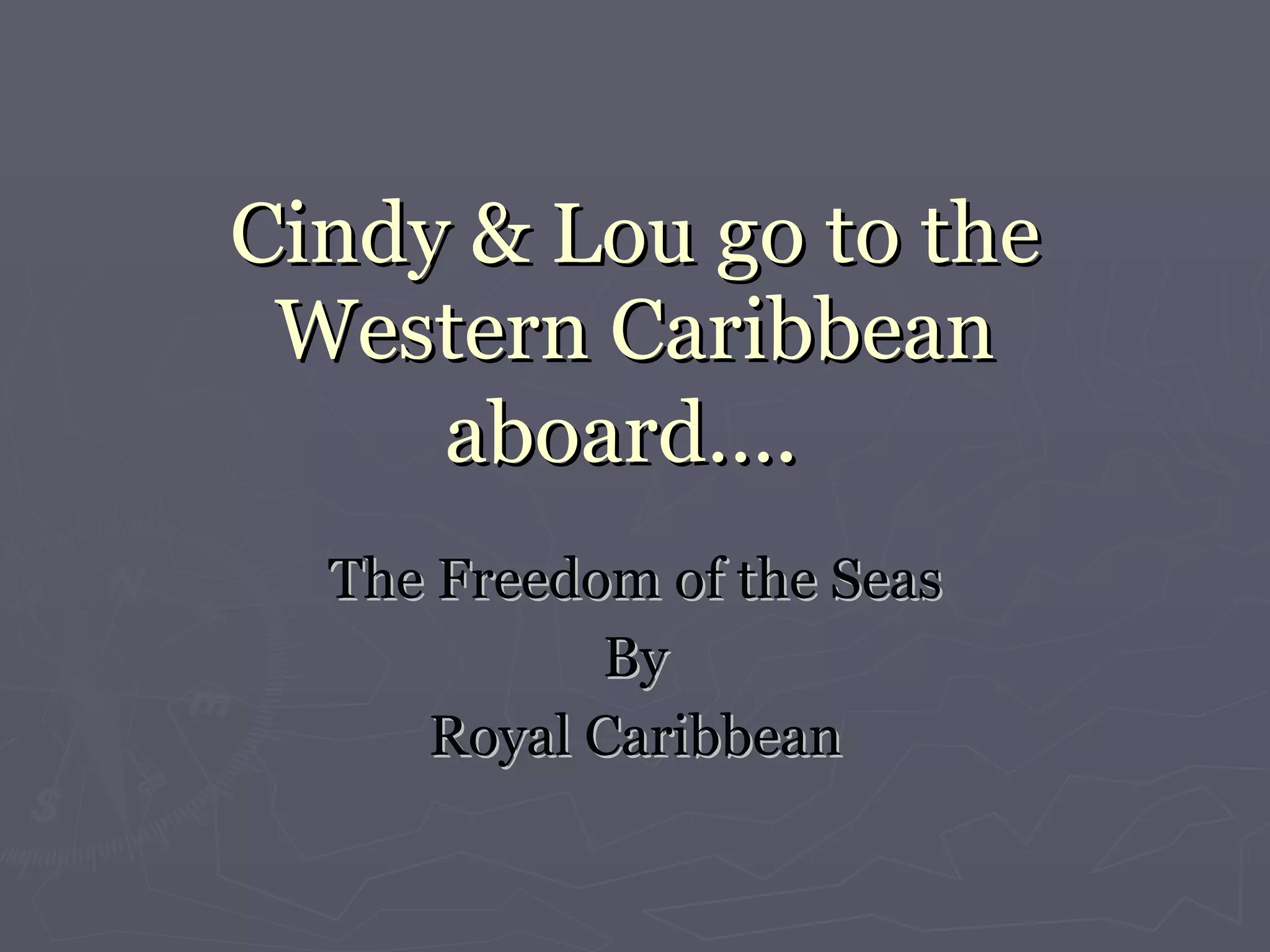 Cindy and Lou go on a cruise aboard the Freedom of the Seas ship by Royal Caribbean. They experience many activities including rock climbing, swimming in multiple pools, hot tubs, and scuba diving to view colorful fish. They also enjoy dining on prime rib and gazpacho soup. By the end of the cruise, Cindy and Lou feel refreshed but also acknowledge they may be getting too old for some of the more adventurous activities.
