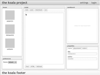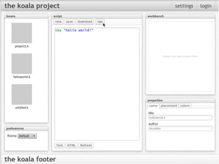 The document describes The Koala Project which aims to help beginners learn computer programming through a web-based interface that eliminates the need to set up platforms, languages, and IDEs which can be confusing for newcomers. It outlines the goals of using plain English and an intelligent interpreter to provide a quick and easy learning experience for new programmers.