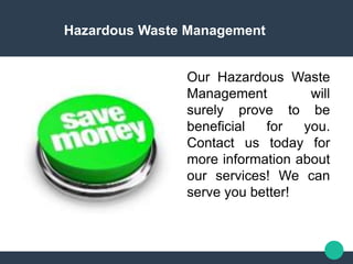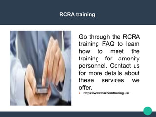 The document outlines training services related to RCRA, hazardous waste management, OSHA, GHS, and bloodborne pathogens. It encourages readers to contact for more information and provides a website link for further details. Additionally, it includes contact information and an address in Phoenix, Arizona.