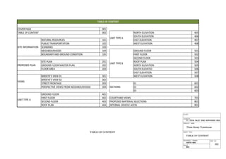 This document contains information about the natural resources, public transportation, sceneries, boundaries, and neighborhood surrounding a site for a proposed three-storey townhouse development. It includes maps showing locations of parks, schools, bus stops, views of nearby islands, and surrounding land uses. Detailed plans are provided for the site plan, unit layouts, elevations and sections of the proposed three-storey townhouse development.