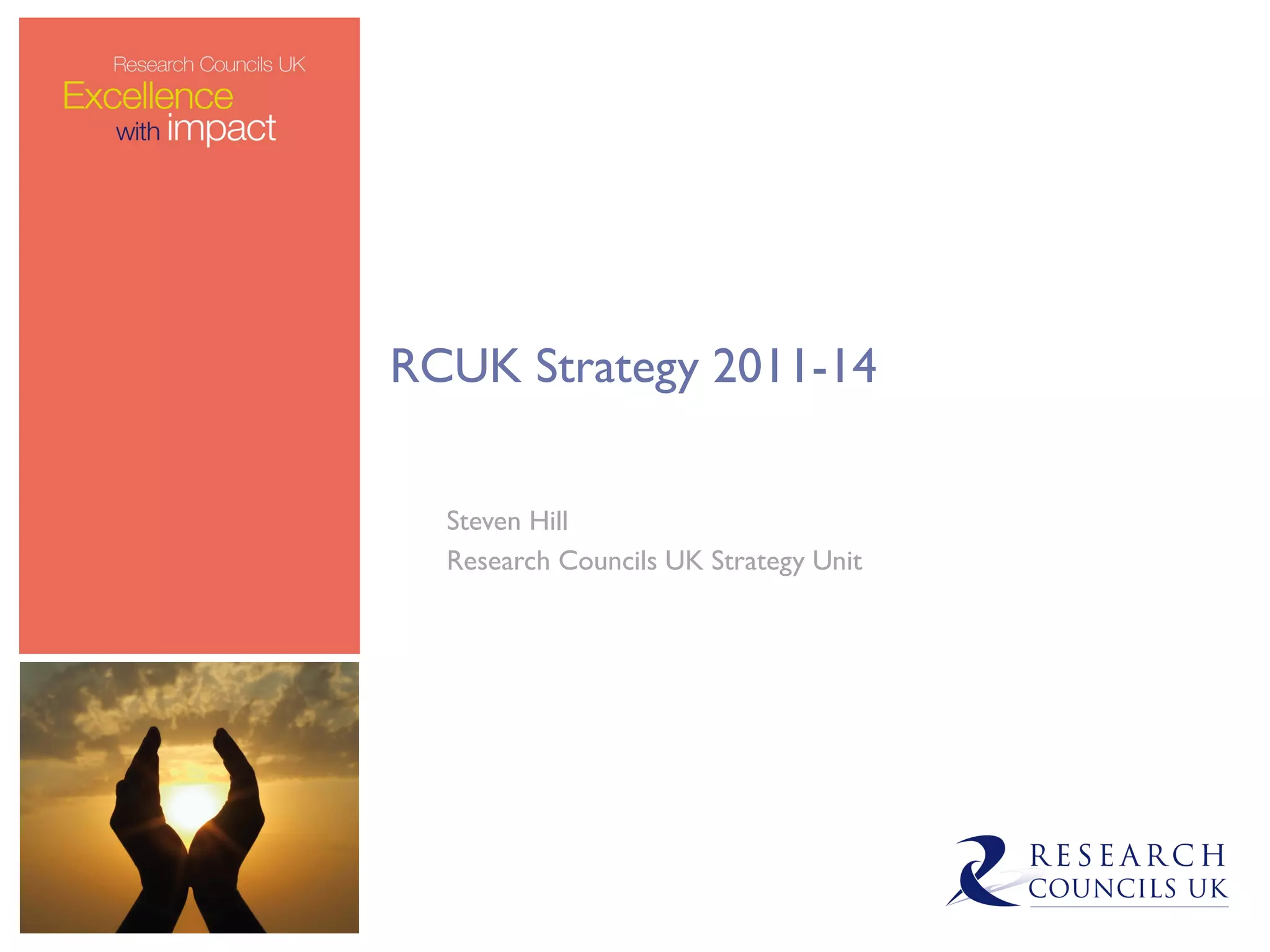 The document outlines the RCUK strategy for 2011-2014, focusing on enhancing the UK's research capabilities to support a productive economy and address societal challenges. It discusses funding allocation, research performance, and strategic priorities while emphasizing the need for collaboration, open access to data, and public engagement in research activities. Key funding figures and performance metrics highlight the UK’s competitive standing in global research despite challenges in financing and resource allocation.