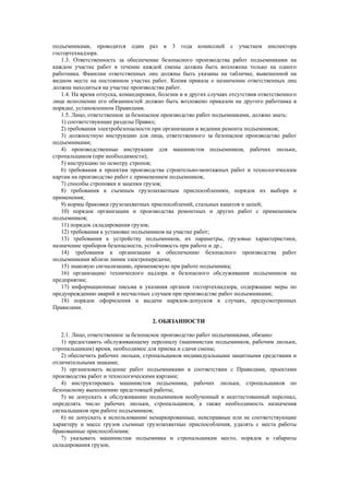 Типовая инструкция для лиц, ответственных за безопасное производство работ подъемниками была утверждена госгортехнадзором России и требует от эксплуатирующих организаций разработки и утверждения должностной инструкции, учитывающей местные условия. Ответственные лица должны обладать знаниями по правилам безопасности, а их обязанности включают обеспечение безопасной работы, инструктаж персонала и пресечение нарушений. Ответственность за безопасность несет назначенное лицо, которое должно следовать правилам и инструкциям, а также контролировать обучение и квалификацию рабочего персонала.