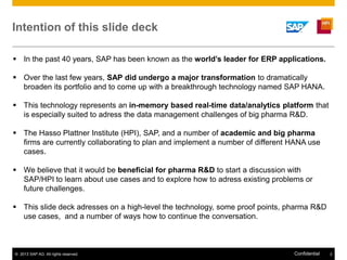 This document discusses how SAP's in-memory database platform called SAP HANA could benefit pharmaceutical research and development. It provides an overview of SAP HANA's technology capabilities such as massively parallel processing, large in-memory datasets, and text analytics. It then discusses proof points of SAP HANA's use in genomics to dramatically speed up DNA analysis. The document outlines potential use cases of SAP HANA in areas like secondary analysis of genome data, clinical trial data analysis, and virtual patient simulation. It concludes by recommending next steps for pharmaceutical companies to start