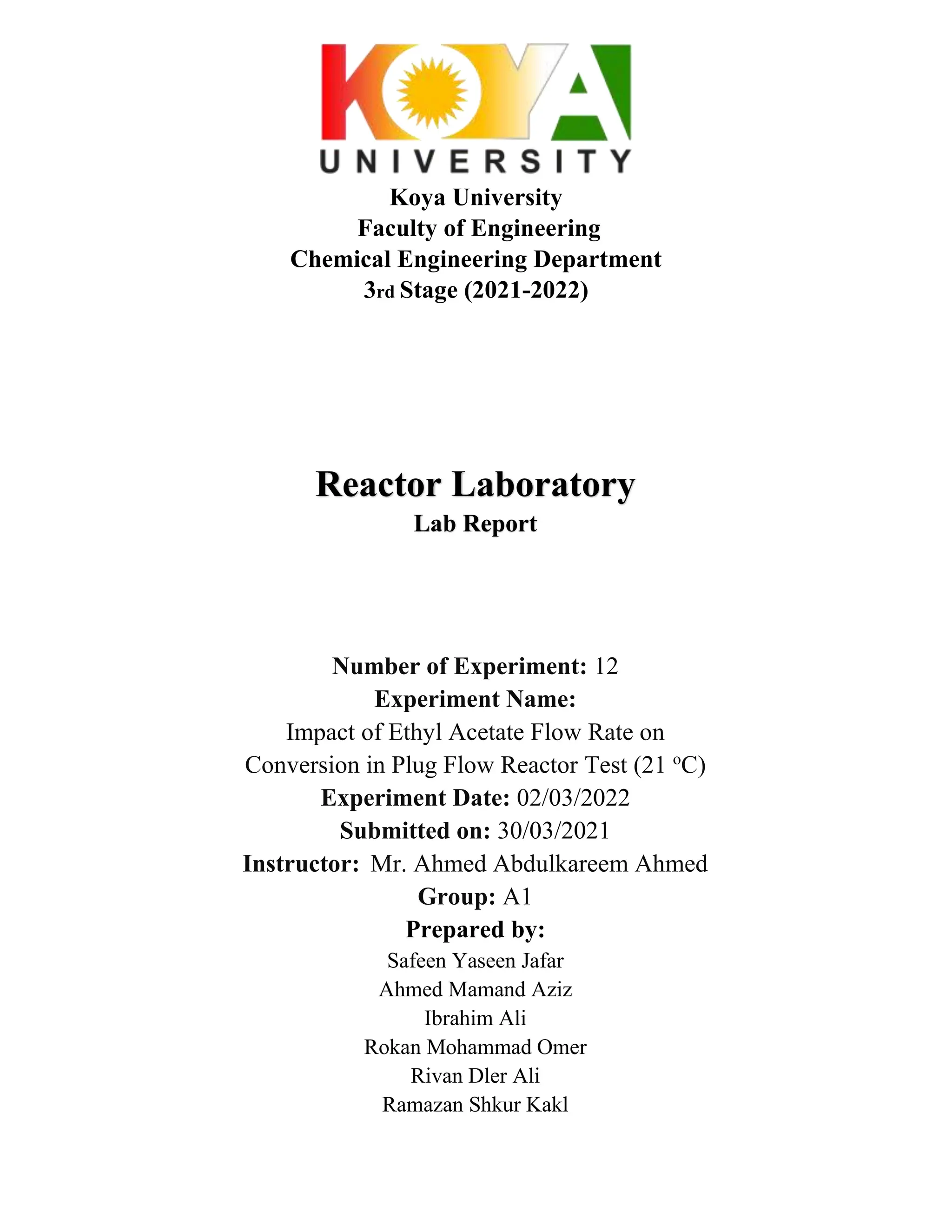 This lab report summarizes an experiment examining the impact of ethyl acetate flow rate on conversion in a plug flow reactor at 21°C. Students measured conductivity at four increasing flow rates and calculated conversion using conductivity readings. Results showed conversion decreased as flow rate increased, because higher flow rates gave reactants less time to fully react before exiting the reactor. The experiment helped students learn how conversion in a plug flow reactor is affected by changing an inlet flow rate.