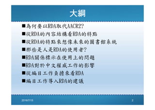 陳和琴教授(2012)。淺談新內容標準RDA的使用。國立臺灣大學圖書